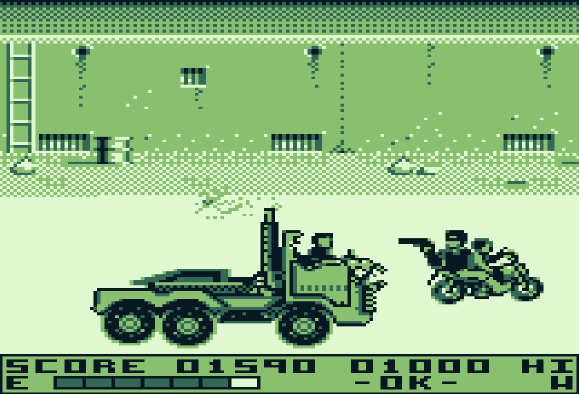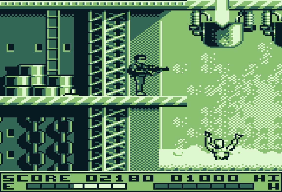 Jetzt haben wir es geschafft: Der letzte Level und damit die Konfrontation mit dem T-1000 steht bevor und ja, es ist wahr – dieser Endboss ist einer der lächerlichsten in der Geschichte der Game Boy Spiele. Erstens steht er einfach nur da und bewegt sich nicht – gediegen wartet er ab bis ihr euch ihm nähert. Langsam bewegt er sich dann auf euch zu während von der Decke im Stahlwerk diverse Waffen fallen. Die könnt ihr fix aufnehmen und am T-1000 auslassen. Hat er genügend Treffer eingesteckt verwandelt er sich von seiner menschlichen Form in die Flüssigmetall-Version. Das Prozedere ändert sich aber nicht: sammelt fleißig herumliegende Waffen auf, leert eure Magazine und treibt den Boss bis an den Rand des Wahns… äh, zum Flüssigmetallbecken. Jetzt verpasst ihm ein paar Schüsse aus dem Granatwerfer und die Menschheit ist gerettet.