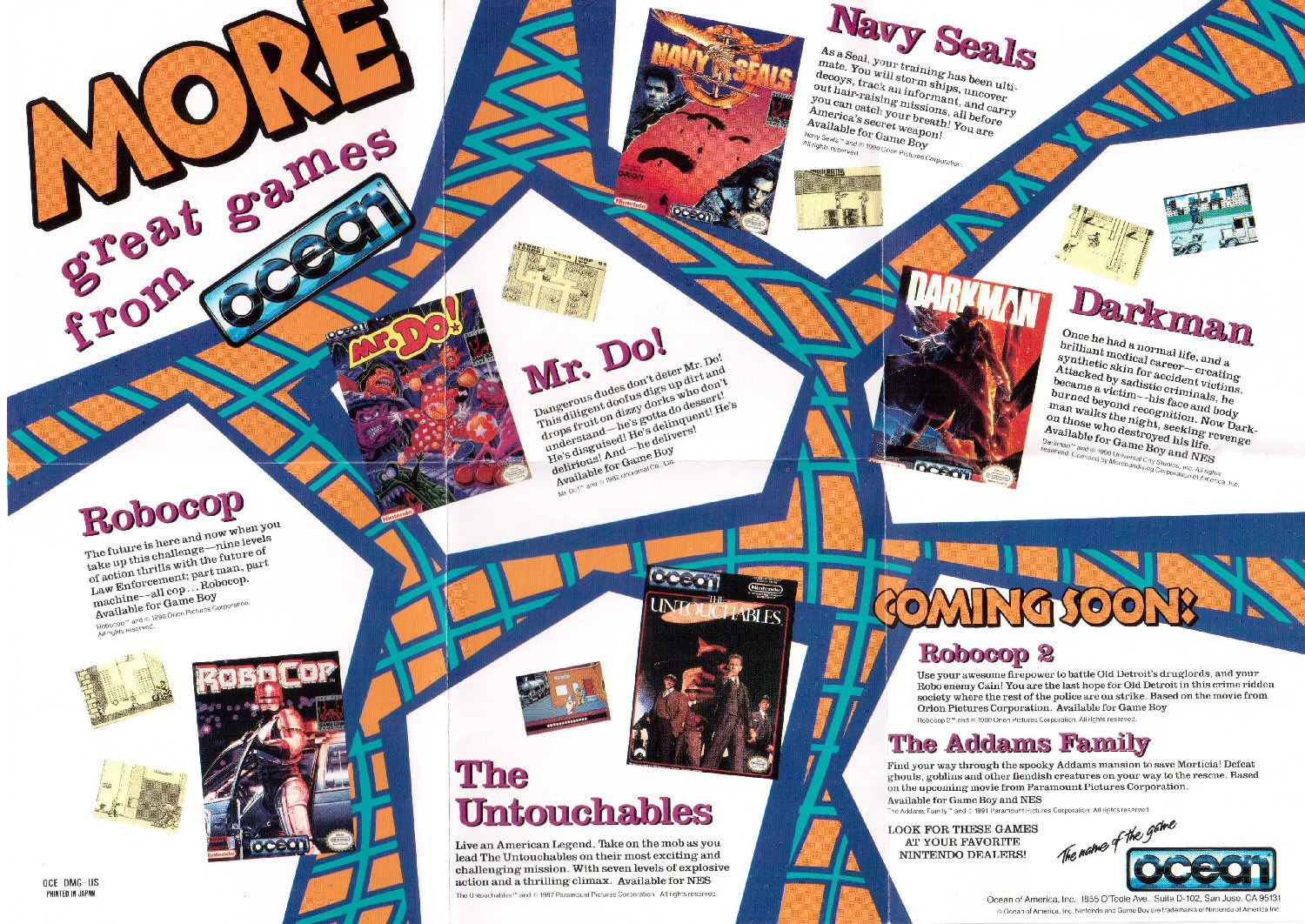 (pwc) Wieder ist ein neuer Flyer eingetrudelt: Der OCE-DMG-US. Der Flyer ist beidseitig bedruckt. Auf der Vorderseite befindet sich ein Miniposter mit Darkman Motiv. Auf der Rückseite erhalten wir eine Auswahl der Ocean Produktpalette: Mr. Do!, Robocop, Navy Seals und Darkman (Game Boy) sowie The Untouchables (NES).