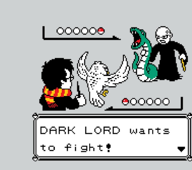 (pwc) Die Pokémon Spiele für Game Boy Classic und Color erfreuen sich weiterhin größter Beliebtheit. Nur so ist es zu erklären, wieso sich der Kampfbildschirm in regelmäßigen Abständen auf Textilien wiederfindet. Bei diesem T-Shirt tritt der weltbeste Pokémon-Trainer Harry mit Schneeeule Hedwig gegen den bösen Trainer Lord Voldemort mit Serpent Nagini an. Wer wird wohl gewinnen?