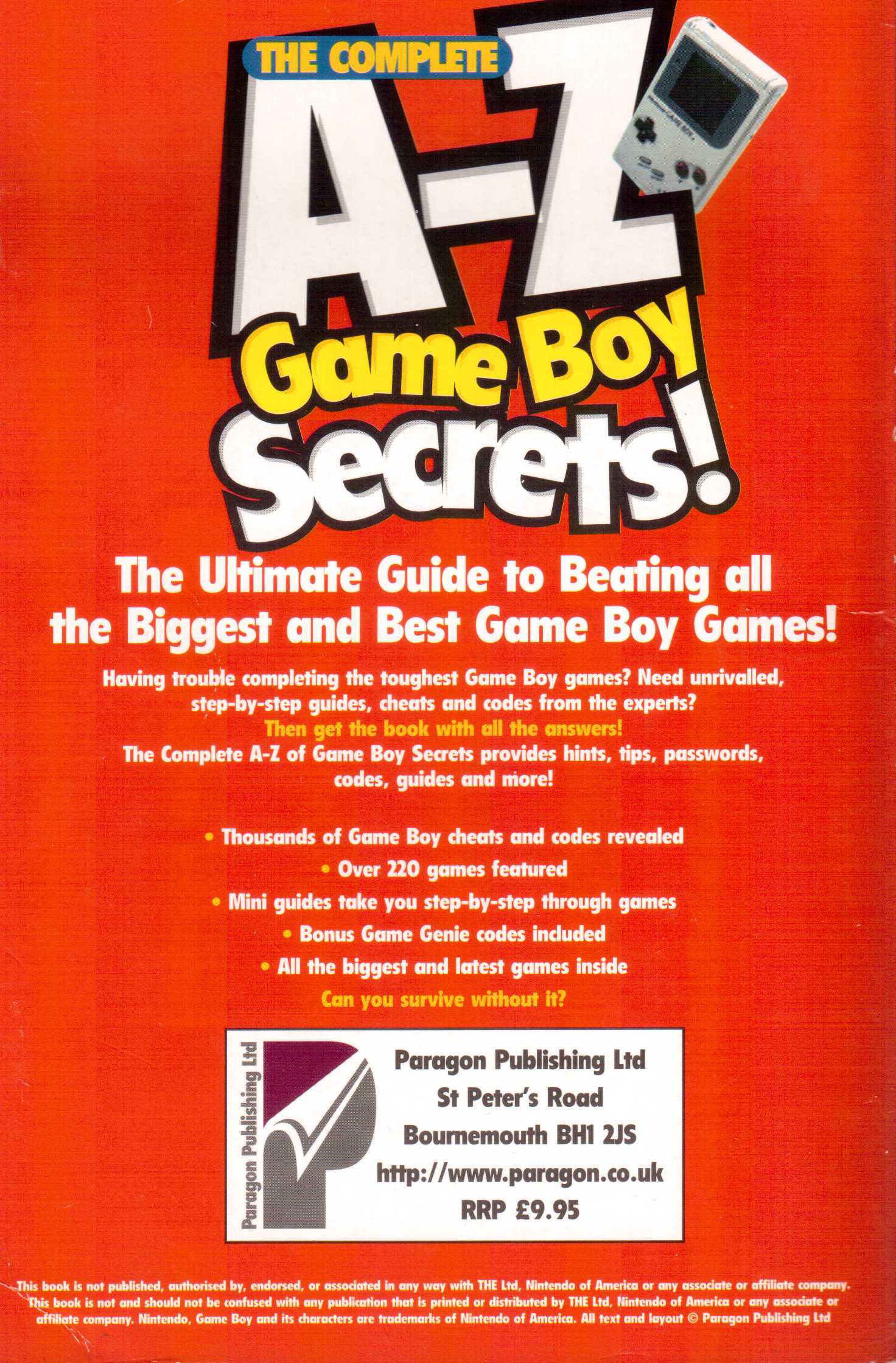 (pwc) „Der ultimative Führer um den Game Boy zu schlagen“ heißt es vollmundig auf dem Cover. Die kompletten Game Boy Geheimnisse von A-Z. Hört sich an wie eine Offenbarung an die vielen tausend Game Boy Jünger. Tatsächlich erhält man mit diesem Buch eine Sammlung die ohne Vor- und Nachwort gleich mit unzählig vielen Tipps, Tricks, Passwörtern und Codes aufwartet: Insgesamt 228 Game Boy und Game Boy Color Spiele wurden berücksichtigt.