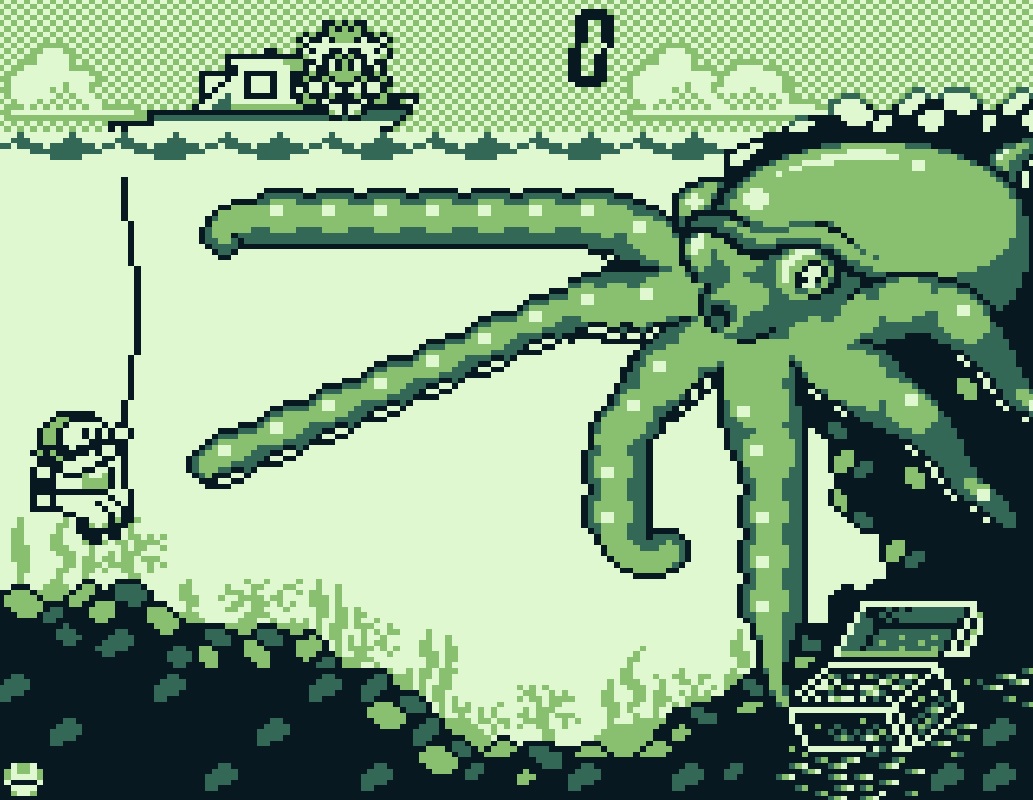 Octopus ist meines Erachtens das schwierigste der vier G&W Titel. Als Taucher versuchen wir den Schatz am Meeresgrund zu bergen und zurück zum Boot zu bringen. Hierbei werden wir allerdings von den langen Tentakelarmen eines riesigen Octopus gestört. Diesen muss man sehr geschickt ausweichen und manchmal reicht es lediglich in die Nähe eines ausgetreckten Arms zu gelangen um gepackt zu werden. In der modernen Version von Octopus steuern wir Mario als Taucher. Witzig: Im Boot wartet Prinzessin Toadstool.