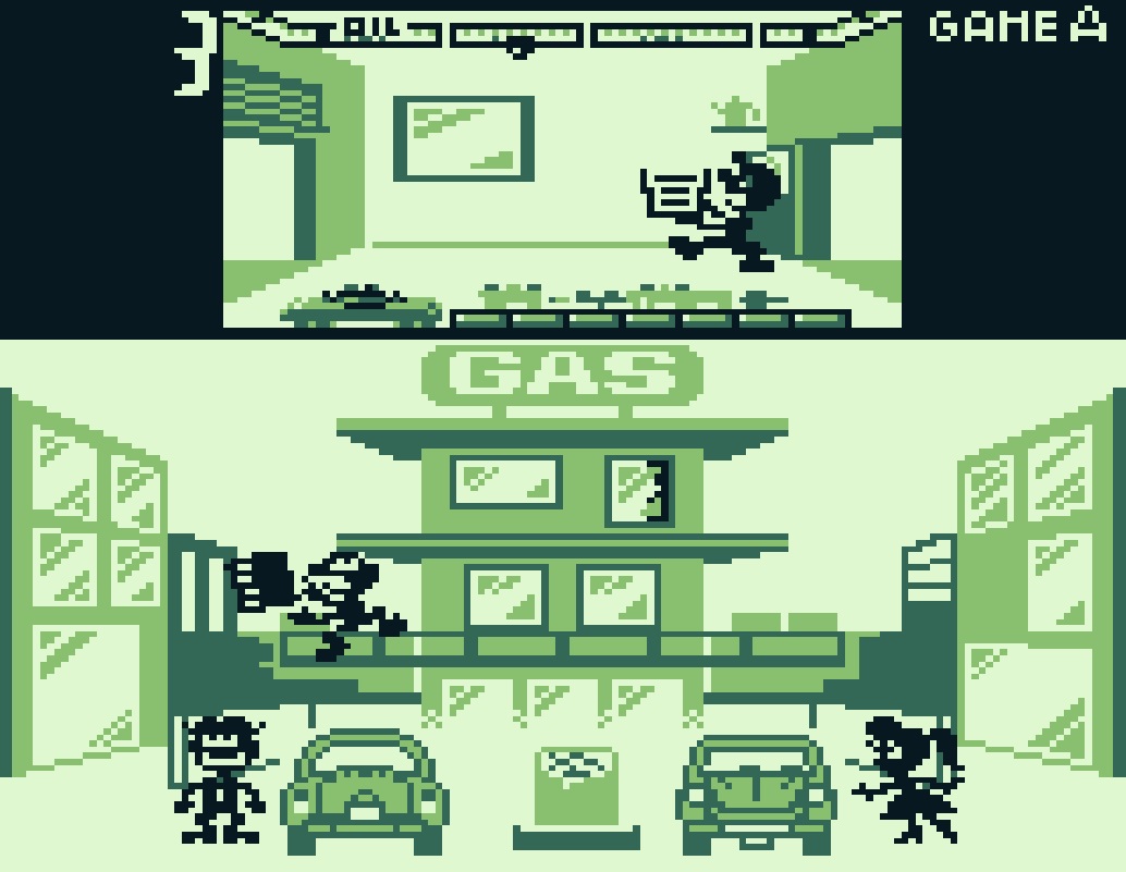 Bei Oil Panic ist der Name Programm. Von der Decke der Tankstelle tropft Öl. Scheinbar handelt es sich um eine undichte Leitung. Mit zwei Eimern in der Hand müssen wir die Tropfen auffangen – hierbei sollte beachtet werden, dass lediglich drei Tropfen in einen Eimer passen. Wenn die Eimer voll sind, müssen wir das aufgefangene Öl an unseren Helfer eine Ebene tiefer übergeben. Geht dabei etwas schief klatscht das Öl direkt auf die armen Tankstellenkunden. In der modernen Version steuern wir Mario und Yoshi.