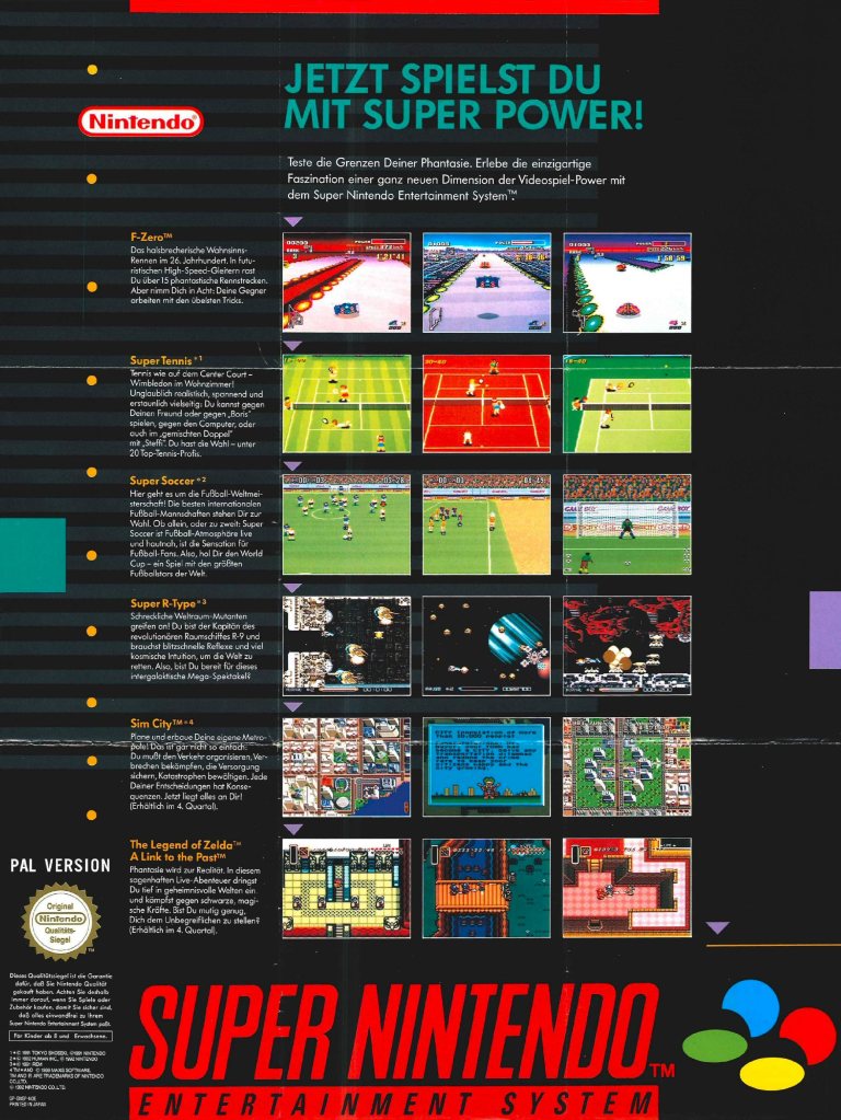 (pwc) Neu in der Sammlung: Der SNES Werbeflyer GP-SNSP-NOE im Großformat 39,5 x 30 cm. Dieser Flyer in Postergröße ist mir bisher noch nicht unter die Augen gekommen. Entsprechend zusammengefaltet passt er auch in jede Game Boy OVP, allerdings lässt die Bezeichnung GP-SNSP-NOE eher darauf schließen, dass der Flyer SNES-Spielen beilag. Die Rückseite des Flyers zeigt mehrere Game Boy Spiele wie zum Beispiel Dr. Mario, Tennis, F-1 Race oder Duck Tales.