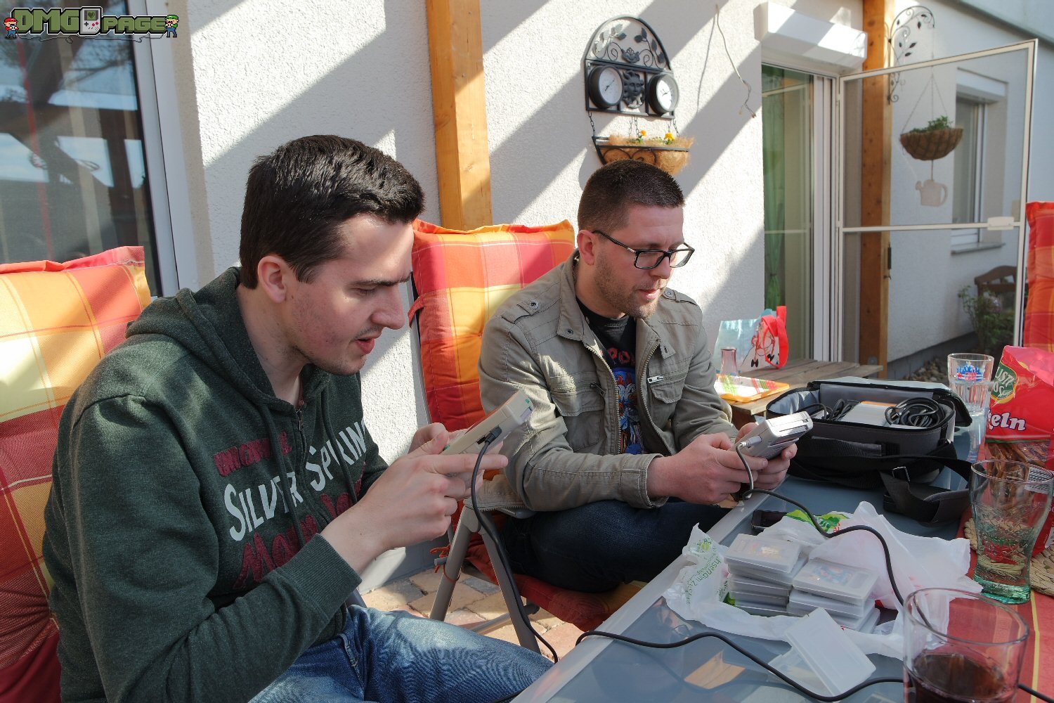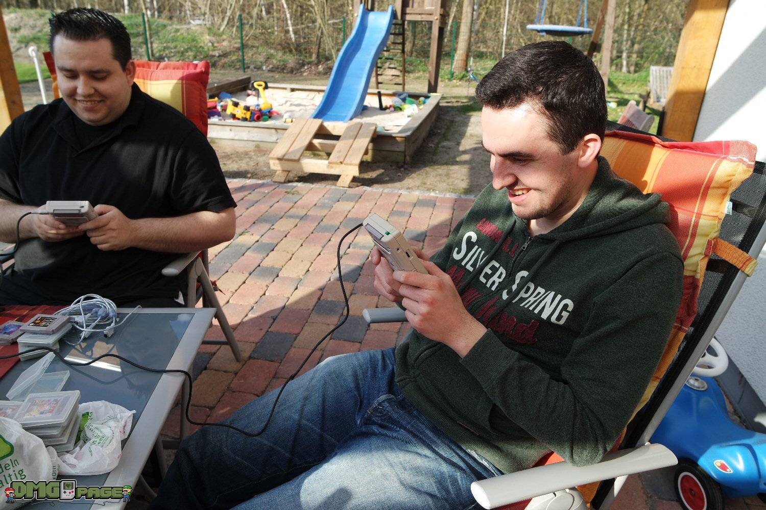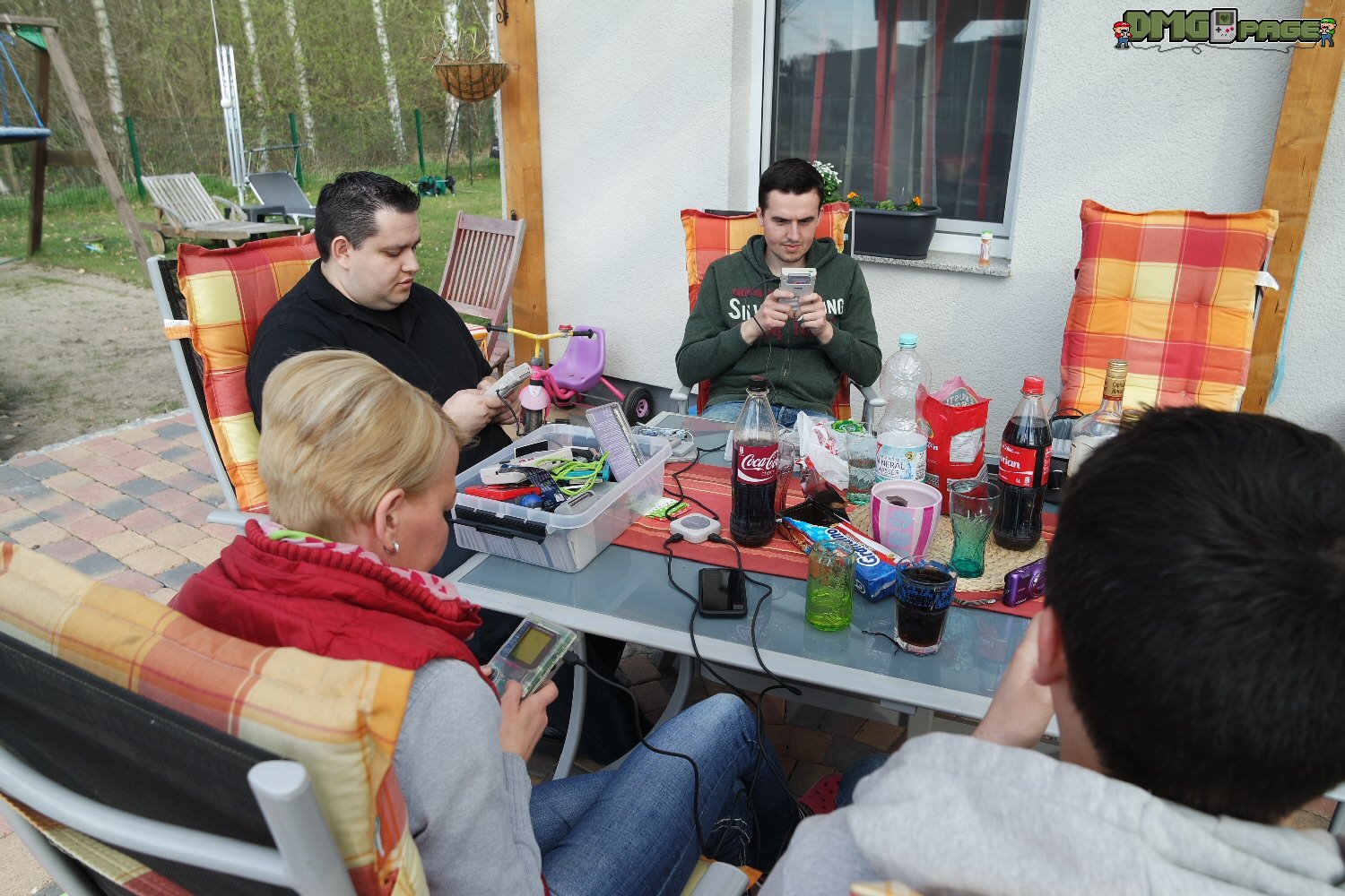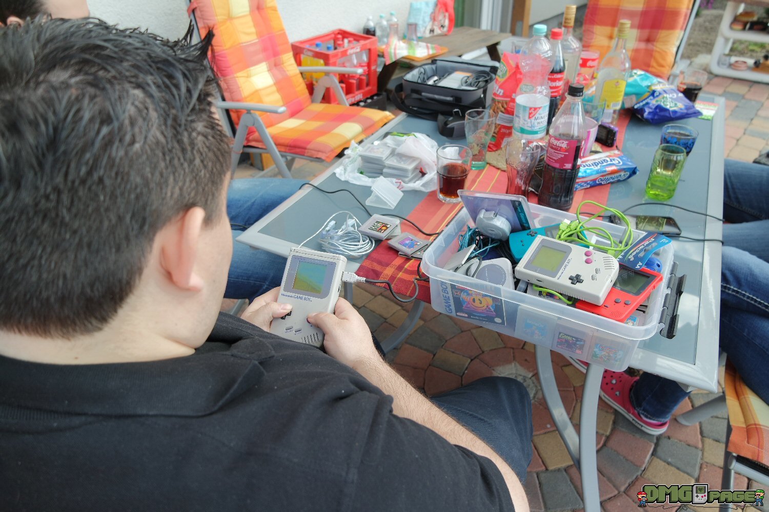 Nach der obligatorischen Begutachtung der wirklich mehr als bemerkenswerten Videogames- und Merchandising-Sammlung, ging es draußen auf der Terrasse bei strahlendem Sonnenschein direkt mit der Action los der wir nunmehr seit Jahren sehnsüchtig entgegengefiebert haben: dem Multiplayerzocken auf dem klassischen Game Boy zu viert über den 4-Player-Adapter.