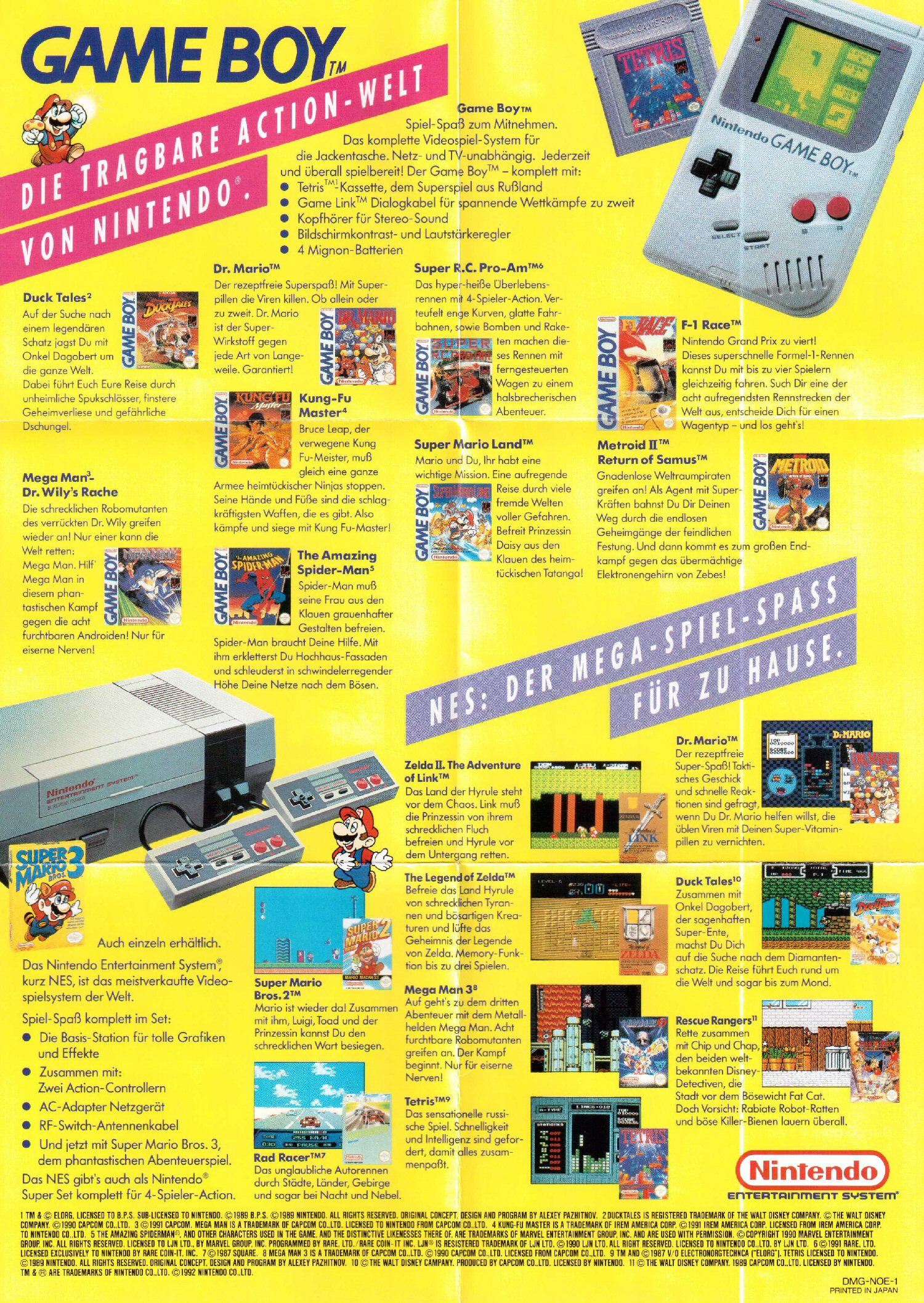 (pwc) Der Game Boy Werbeflyer DMG-NOE-1 gehört zu meinen Lieblingsflyern, da er neben dem Game Boy auch noch das NES berücksichtigt. Auf der Rückseite des Flyers befindet sich übrigens SNES Werbung. Somit sind ganze drei Nintendo Konsolen vertreten. Super! Der DMG-NOE-1 ist auch nicht wirklich selten: ich habe ihn 6 mal in der Sammlung.