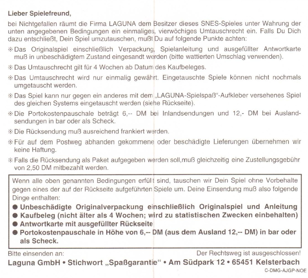 (pwc) Interessant: Die Firma Laguna hat seinerzeit Kunden ein einmaliges vierwöchiges Umtauschrecht eingeräumt. Beim Druck der Antwortkarte C-DMG-AJGP-NOE muss allerdings etwas schief gelaufen sein. Auf beiden Seiten wird jeweils Bezug auf ein SNES-Spiel genommen. Auf der Rückseite der Karte stehen allerdings nur Game Boy Ersatztitel zur Wahl. Wie dem auch sei. Ich gehe davon aus, dass der SNES-Hinweis falsch platziert wurde.