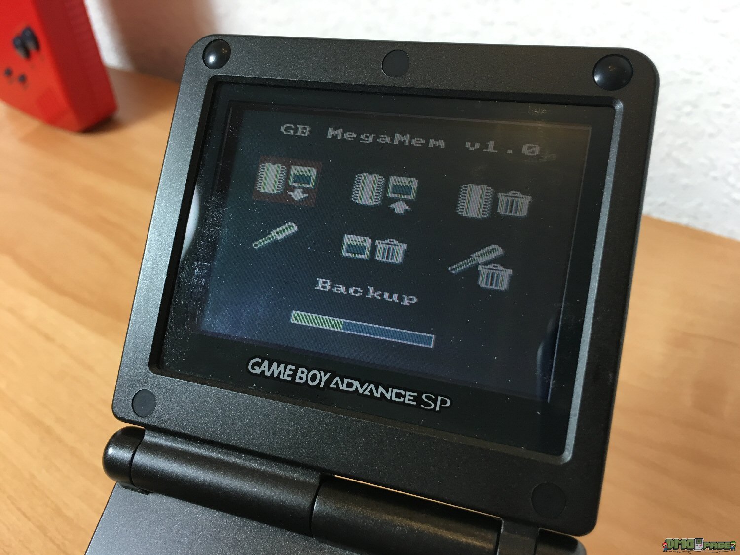 Schaltet den Game Boy Advance SP ein und wählt im Mega Memory Menü direkt die erste Optionsmöglichkeit „Backup“ aus. Vergebt einen Namen des Speicherstandes und startet den Ausleseprozess. Übrigens: auf dem Mega Memory Modul lassen sich ganze 6 Speicherstände a 30 Bilder sichern!