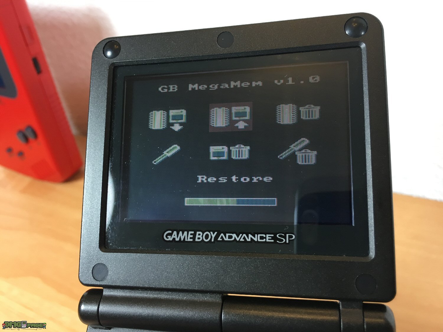 Steckt eure EMS GB USB 64M Flashkarte auf das Mega Memory Modul. Schaltet den Game Boy Advance SP ein und wählt im Menü die zweite Option „Restore“. Von der Mega Memory wird nun die .sav Datei auf die EMS Flashkarte kopiert. Ist dieser Prozess abgeschlossen, zieht die Flashkarte ab und verbindet diese via USB-Kabel mit eurem PC.