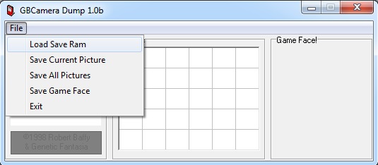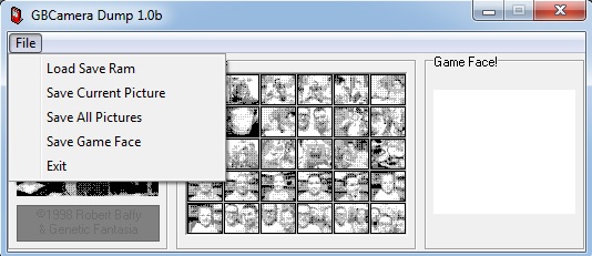 Wählt Read SRAM aus und speichert euch die .sav Datei an einem beliebigen Ort ab. Ist dies bis hierhin reibungslos verlaufen, muss die .sav Datei nur noch in das Programm GBCamera Dump geladen werden. Von dort über die Funktion „Save current Picture“ oder gleich „all Pictures“ die Bilder speichern.