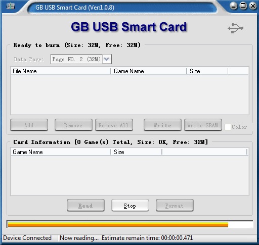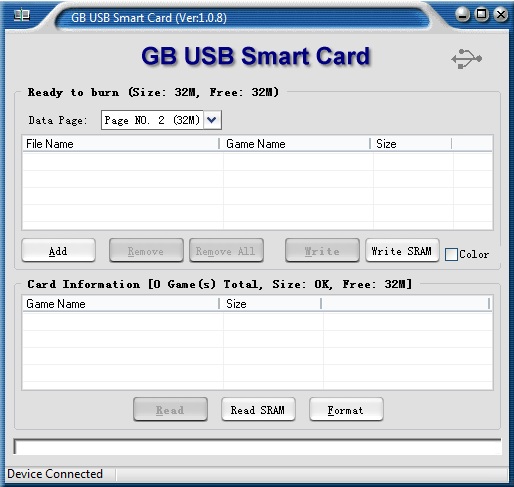 Wenn ihr die Software GB_USB_v1.0.8 startet, öffnet sich ein Fenster in dem ihr die beiden Seiten der Flashkarte auswählen könnt. In meinem Fall befindet sich die .sav Datei auf Seite 2 obwohl das Programm hierzu unter „Card Information“ keinen Hinweis darauf gibt. Dennoch: der Speicherstand ist vorhanden.