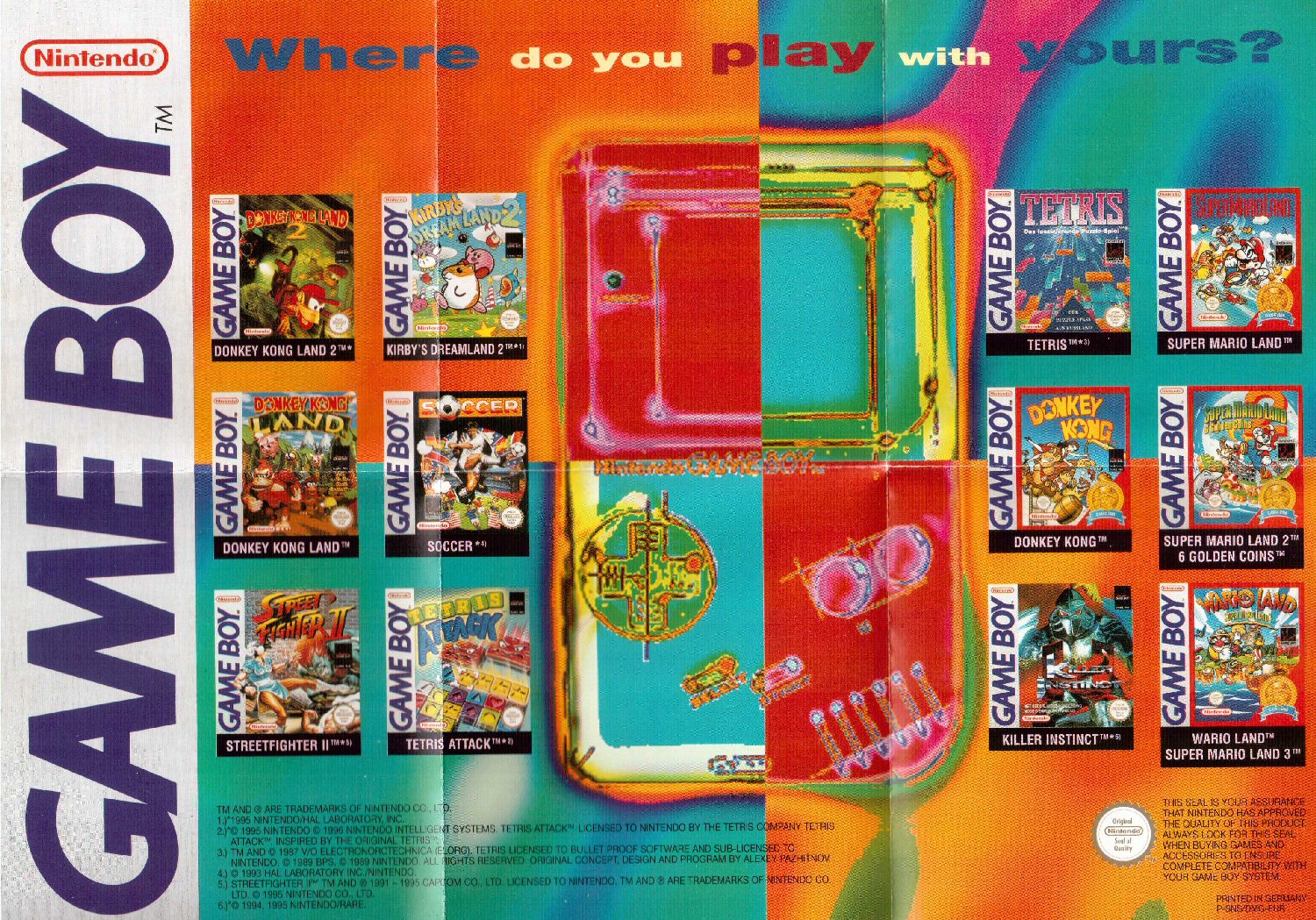(pwc) Der Game Boy Werbeflyer P-SNS/DMG-EUR gehört zu den schönsten Exemplaren die ich besitze. Er dürfte aus der Zeit stammen als die farbigen Game Boy Pocket Modelle den Markt beherrschten. Zwei Dinge fallen direkt ins Auge: Die Spieleauswahl ist komplett gemischt – es liegt kein Schwerpunkt auf möglichst aktuellen Titeln. Dies könnte mit dem Super Game Boy zusammenhängen der seinerzeit stark beworben wurde und auch älteren Titeln wie Soccer zu ganz neuem Glanz verhalf.