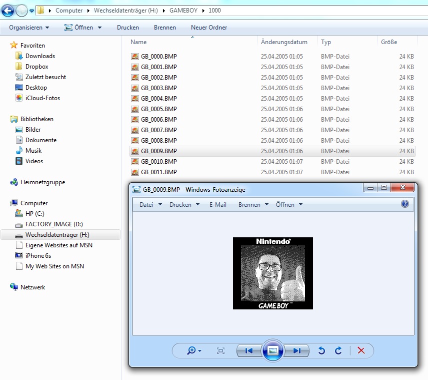 Sind alle Fotos übertragen, einfach den Game Boy ausschalten und die SD-Karte entnehmen. Auf dem PC wird die Karte selbstverständlich als eigenes Laufwerk erkannt und beinhaltet alle gewünschten Fotos. Und das war’s auch schon. Eine einfache und schnelle Möglichkeit eure Game Boy Camera Fotos zu sichern.