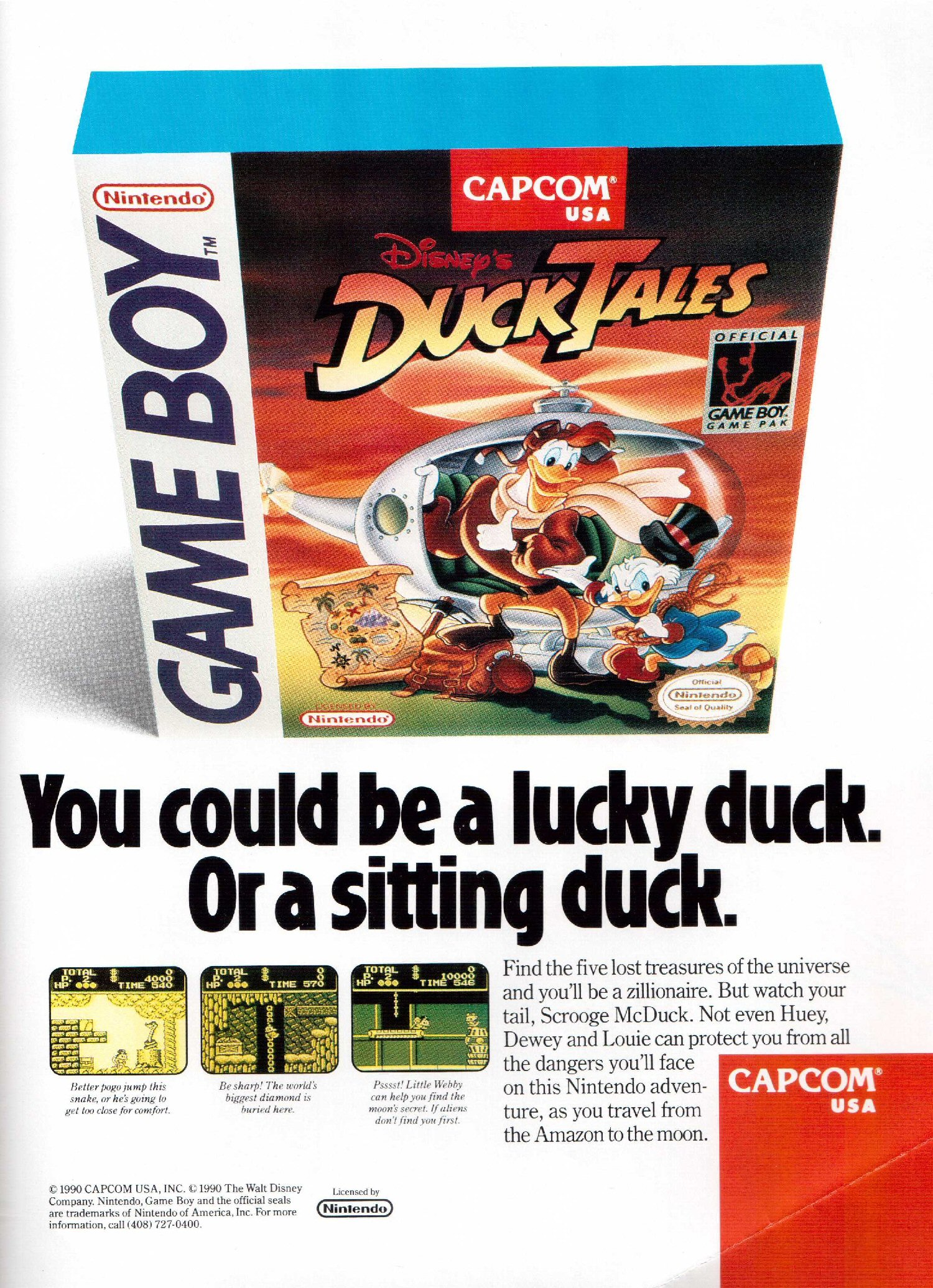 (pwc) Muss man zu Duck Tales noch Worte verlieren? Ein grandioses Jump’n’Run, hübsche Sprites, Backgroundmusic mit Ohrwurmgefahr, ausbalanciert und perfekt spielbar. Duck Tales rockt einfach und gehört in jede ernsthafte Game Boy Sammlung. Die Werbeanzeige wirkt etwas nüchtern – von mir aus hätte sie ruhig etwas lebhafter ausfallen können.