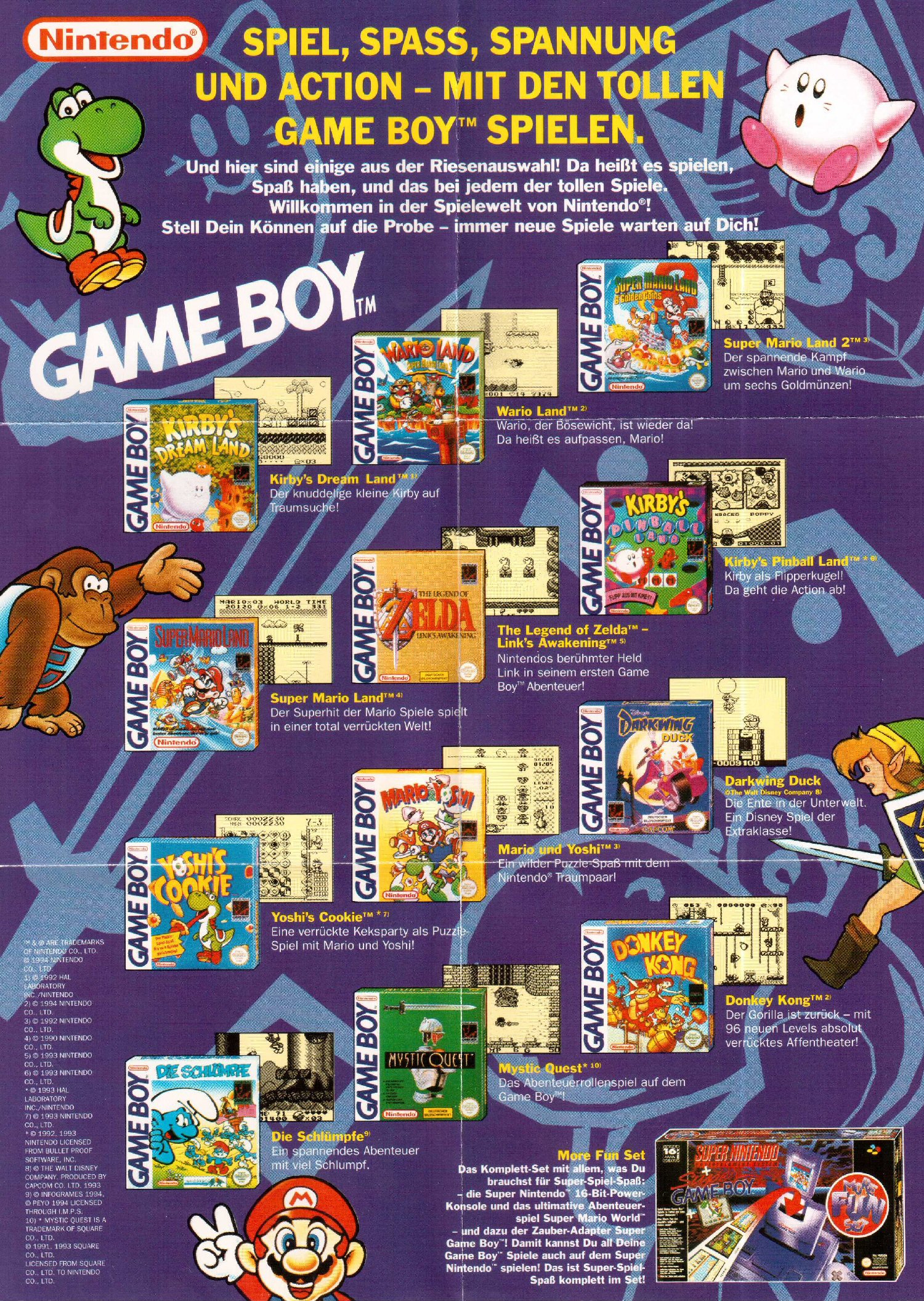 (pwc) Neben diesem Exemplar hier ist das bereits der zweite Flyer, der keinem DMG-Code zuzuordnen ist. Wie dem auch sei: Wir möchten uns nicht an fehlenden Codes aufhängen sondern lieber auf die bunte Welt des Game Boys konzentrieren. Wobei bunt in diesem Fall der falsche Ausdruck ist: Der Flyer berücksichtigt lediglich Game Boy Classic Titel. Dafür aber hochkarätige Spiele wie Link’s Awakening, Darkwing Duck, Donkey Kong oder auch Mystic Quest.