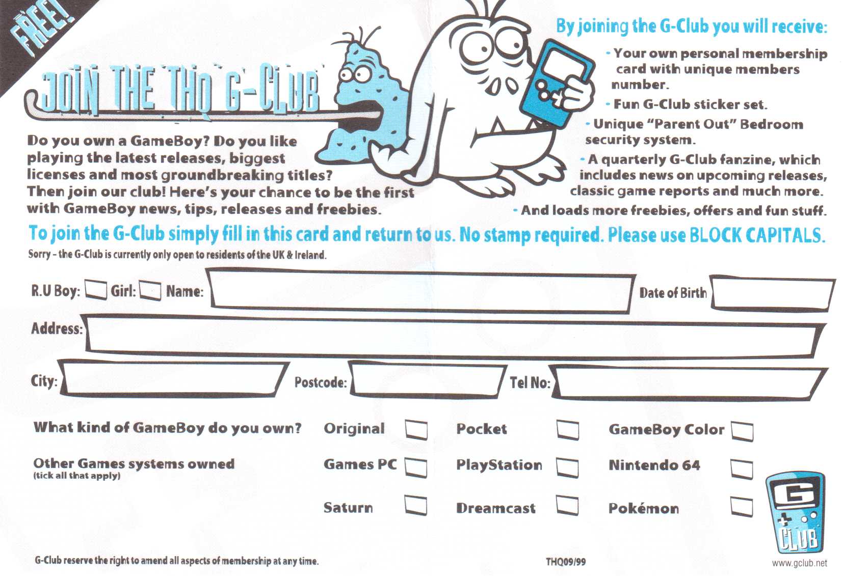 (pwc) Offensichtlich wollte THQ seiner Kundschaft ab Ende der 90er Jahre etwas ganz besonderes bieten: den G-Club. Wer Game Boy Besitzer ist und dem Club beitritt, soll die Chance bekommen als erstes über Neuigkeiten, Tipps und Veröffentlichungen informiert zu werden. Hat man sich erst einmal angemeldet, kann man etwas später auf Post von THQ hoffen. Als Mitglied bekommt man seine eigene einzigartige Mitgliedsnummer, ein lustiges G-Club Aufkleber-Set, ein „Eltern raus“ Schlafzimmer Sicherheitssystem, das vierteljährlich erscheinende G-Club Fanzine sowie eine ganze Menge weiterer lustiger Sachen. So verspricht es zumindest die Anmeldekarte.