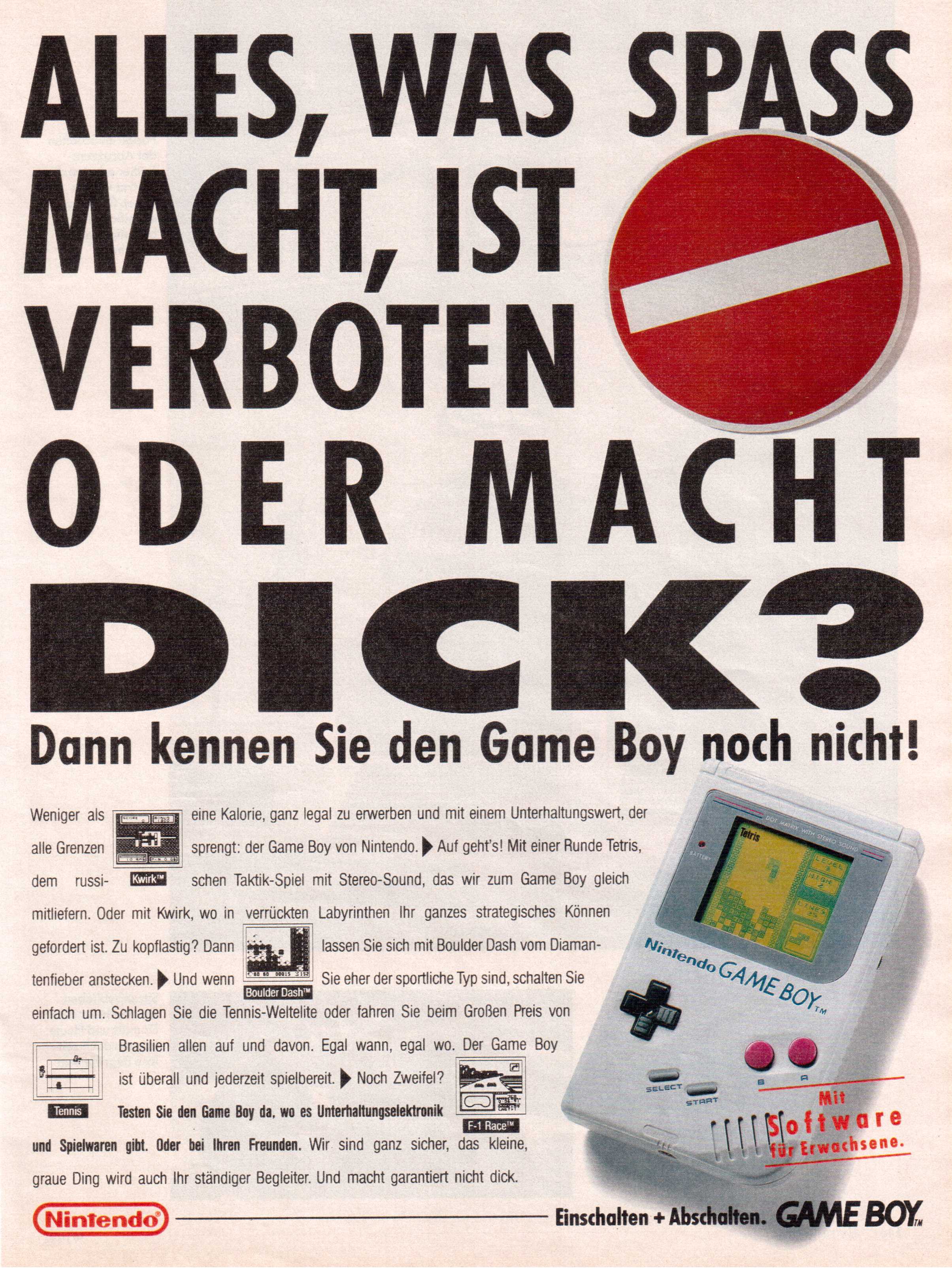 (pwc) Dann kennen Sie den Game Boy noch nicht! Wir sind ganz sicher, das kleine, graue Ding wird auch Ihr ständiger Begleiter. Und macht garantiert nicht dick. Nintendo’s 90er Jahre Werbung ist einfach klasse. Weniger als eine Kalorie, ganz legal zu erwerben und mit einem Unterhaltungswert, der alle Grenzen sprengt: der Game Boy von Nintendo. Tetris, Kwirk, Boulderdash, F-1 Race und Tennis sind die Titel, die in dieser Anzeige beworben werden.