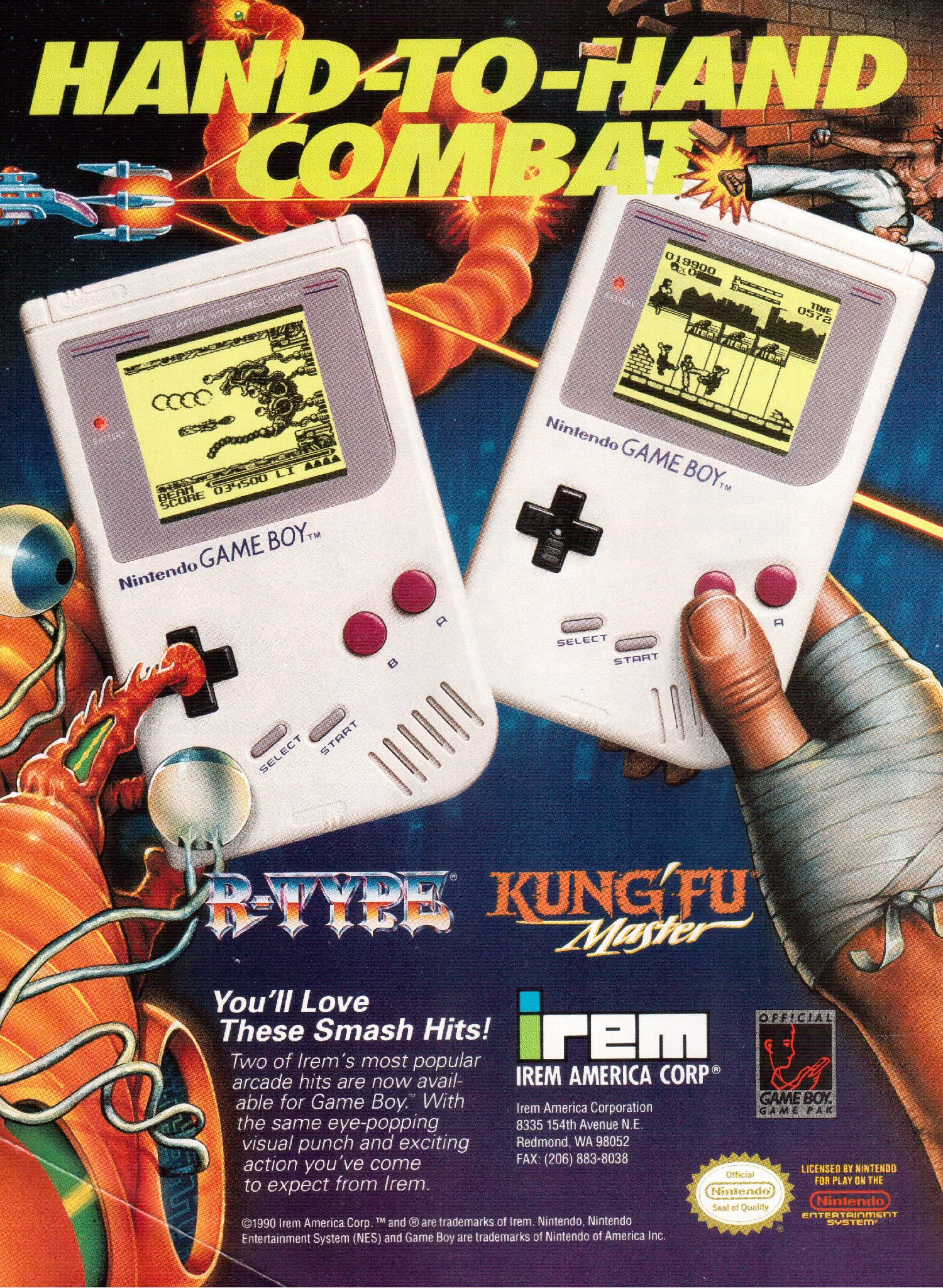 (pwc) R-Type und Kung-Fu Master. Zwei IREM Arcade Klassiker die es in sich haben. Ein Mutant zwei Game Boys. Linker Arm Alien – rechter Arm Martial Artist. Ein tolles Beispiel für eine typische 90er Jahre Werbanzeige. „You’ll love these smash hits!“ – kann ich bestätigen. Sind beides tolle Games.