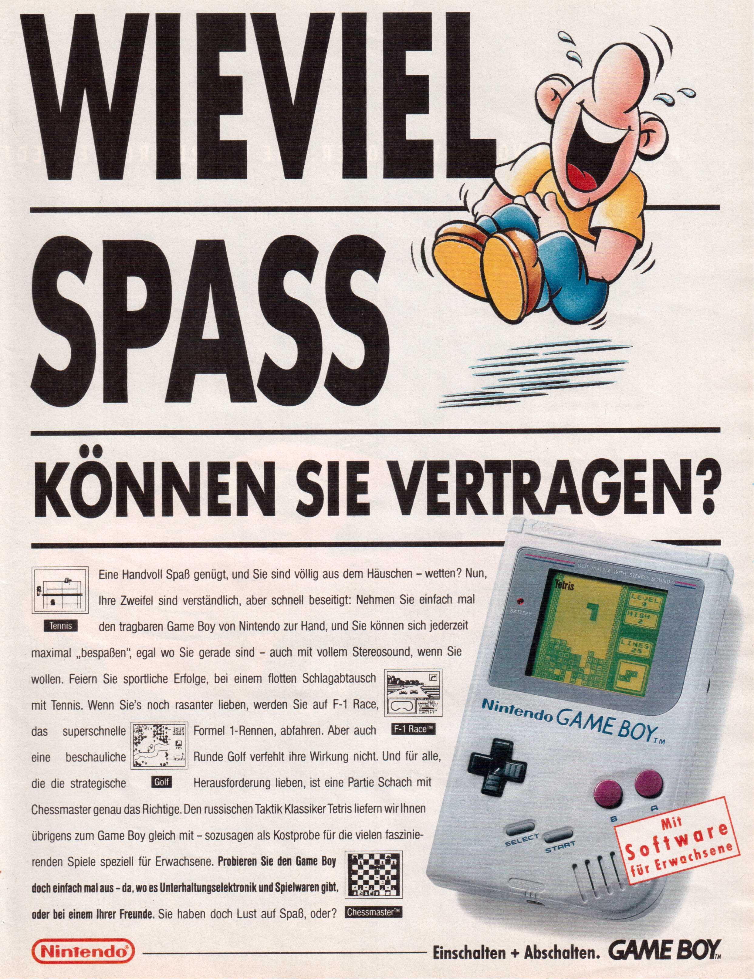(pwc) Der Game Boy wird in dieser Werbeanzeige als ein Gerät zum maximal Bespaßen beworben. Hier ist die Rede von einem flotten Schlagabtausch in Tennis, superschnellen Rennen in F-1 Race oder eine beschauliche Runde Golf. Auch Chessmaster und Tetris werden genannt. Und jetzt die Frage: Wie viel Spaß könnt ihr eigentlich vertragen?