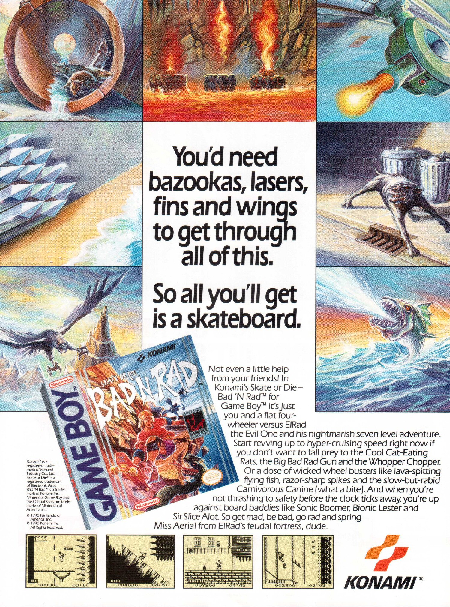 (pwc) Die Bad’n Rad Werbeanzeige zeigt ganz deutlich, dass wir es hier nicht mit einem gewöhnlichen Skateboard-Game zu tun haben: Greifvögel, monströse Fische, Laserapparaturen, böswillige Ratten in der Kanalisation. Puh. Mit dem Hinweis, dass uns für unser Abenteuer tatsächlich nur ein Skateboard zur Verfügung steht, macht das nicht gerade viel Hoffnung. Aber wir schaffen das, oder?