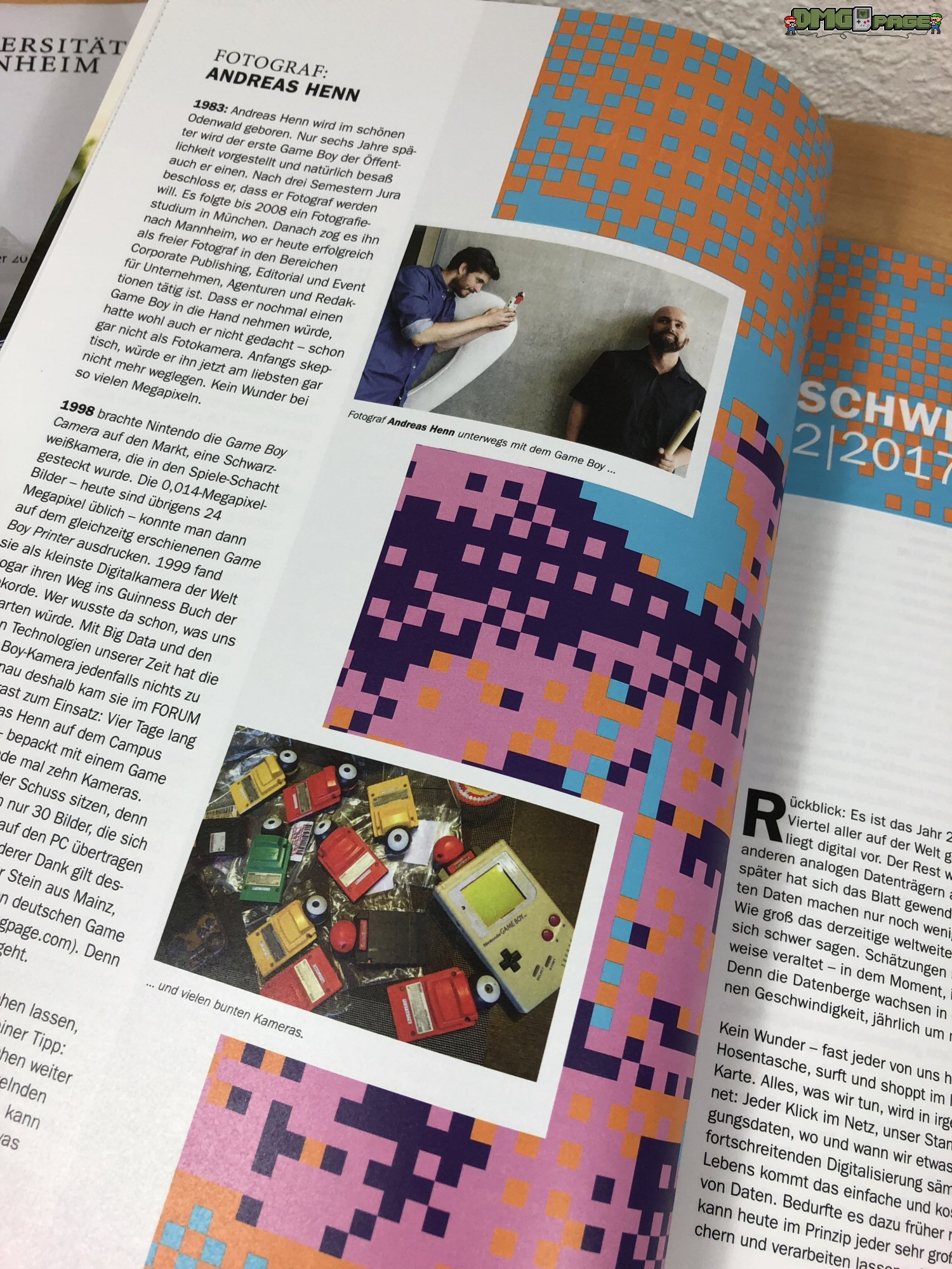 Die Uni Mannheim veröffentlicht mindestens zweimal im Jahr das FORUM-Magazin. Die ►Ausgabe 2/2017 wird sich mit der Macht der Daten und wie Big Data unsere Welt verändert, beschäftigen. Im Kontrast zum technischen Fortschritt unserer Zeit, wolle man dem „hier und jetzt“ längst vergangene und überholte Technik gegenüberstellen. Was bietet sich da nicht besser an, als die im Jahr 1998 veröffentlichte ►Game Boy Camera!