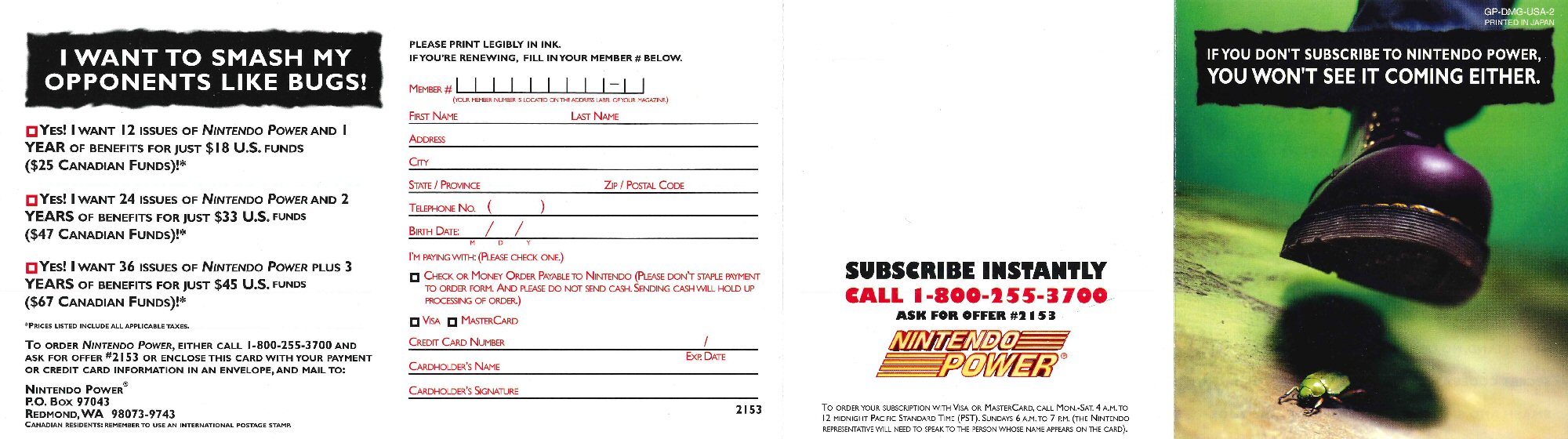 (pwc) Neben dem ►GP-DMG-USA und dem ►GP-DMG-USA-1 Game Boy Nintendo Power Flyer, kommt hier der dritte und offensivste. Gespickt mit direkten oder indirekten Superlativen sollte die Zeitschrift mit aller Macht unter’s Volk gebracht werden. Und immer dran denken: Subscribe to Nintendo Power and nobody will ever bug you again.