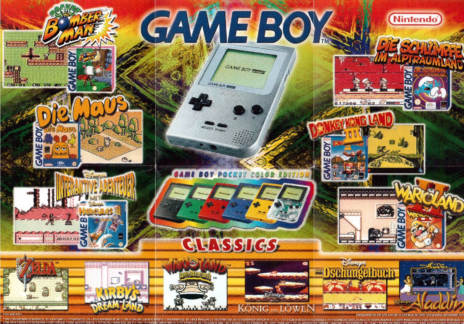 (pwc) Woahhh … der totale Farbrausch. Der Flyer P-NUS (NOE)-NOE 4 präsentiert uns die farbigen Game Boy Pocket Modelle. Und schaut euch mal unten rechts den Super Game Boy Rahmen zu Aladdin an. Genial.
