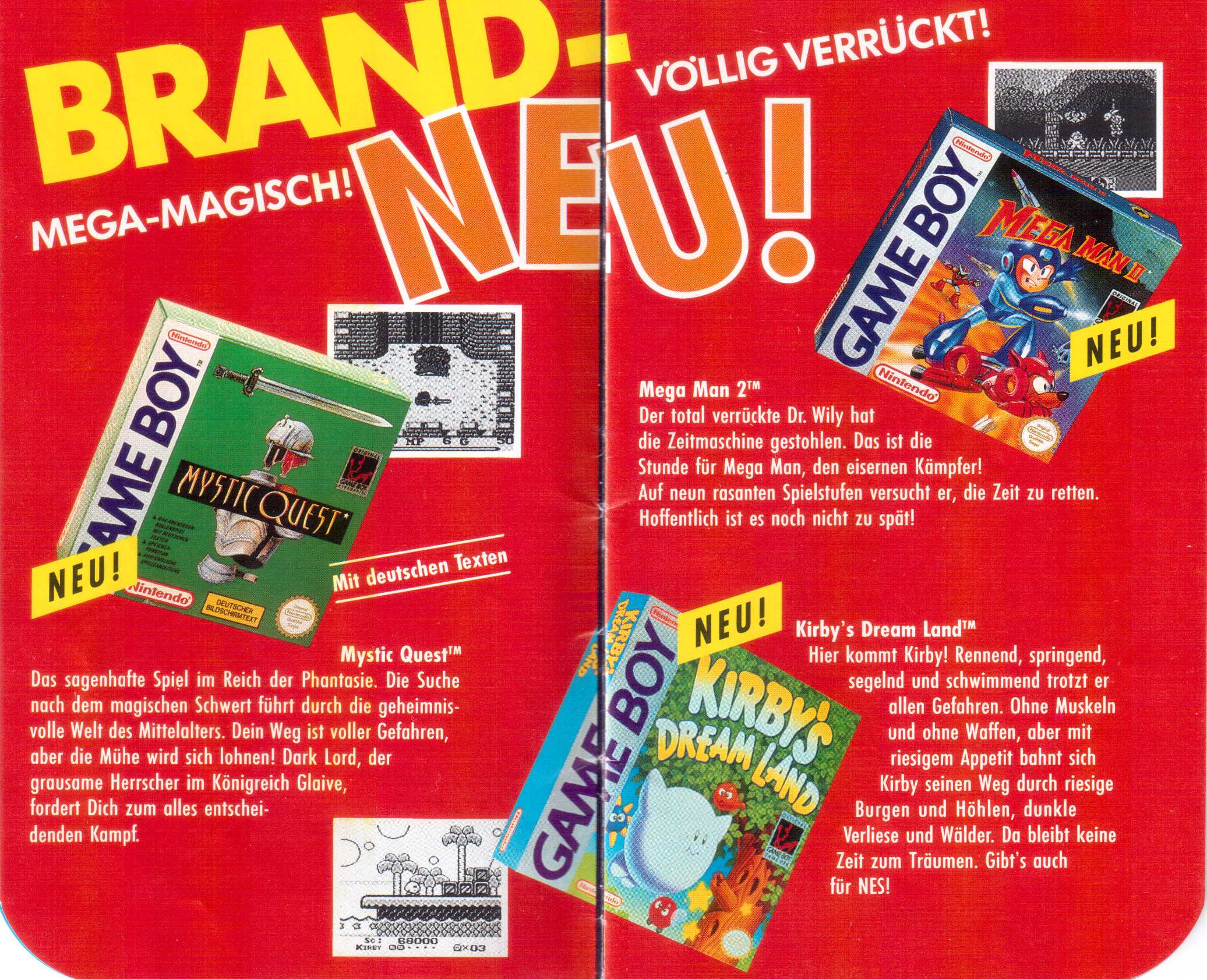 (pwc) Dann schauen wir uns doch einmal die brandneuen Spiele bis Herbst 1993 an: Mega Man II, Kirby’s Dream Land, Mystic Quest, Super Mario Land 2 – 6 golden Coins, Mickey’s Dangerous Chase, Magnetic Soccer – die Auswahl kann sich sehen lassen. Abgerundet wird die Game Boy Broschüre von Titeln, die bereits davor veröffentlicht wurden: F-1 Race, Duck Tales, The Chessmaster, Metroid II oder Dr. Mario zum Beispiel. Ich liebe diese Game Boy Werbung im handlich Format für die Hosentasche. Dasselbe Design findet ihr unter anderem auch bei folgenden Broschüren: