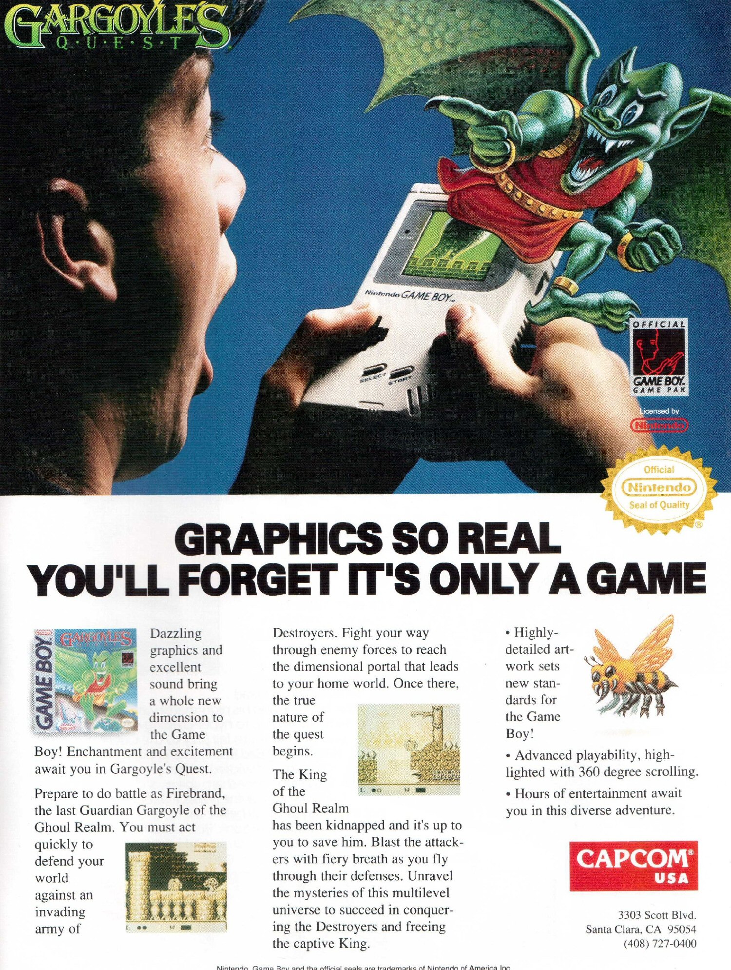 (pwc) Grafiken die so echt wirken, dass du vergessen wirst, dass es sich bei Gargoyle’s Quest nur um ein Spiel handelt. Diese Werbebotschaft gefällt mir sehr gut. Zusammen mit Ghostbusters II von Activision (►Best Game Boy Graphics ever!) haben wir mit Gargoyle’s Quest bereits das zweite Spiel, dass uns grafische Wunder verspricht. Und in der Tat finde ich das Game wirklich schön gepixelt. Achja, ich vermisse die Werbung der 90er Jahre^^