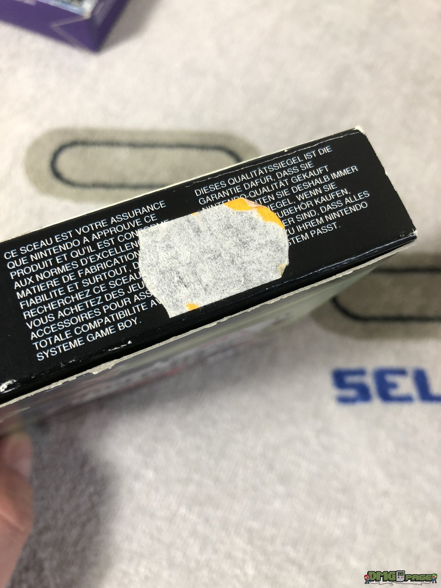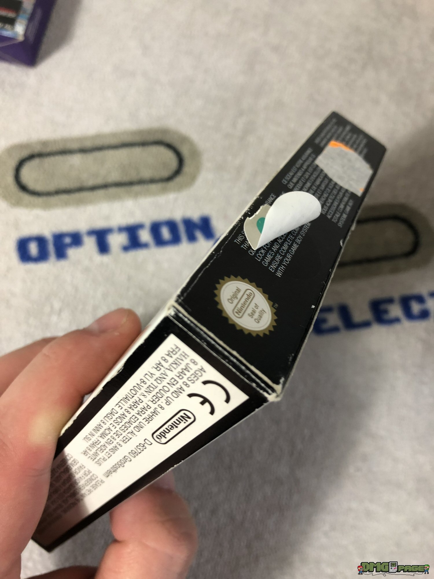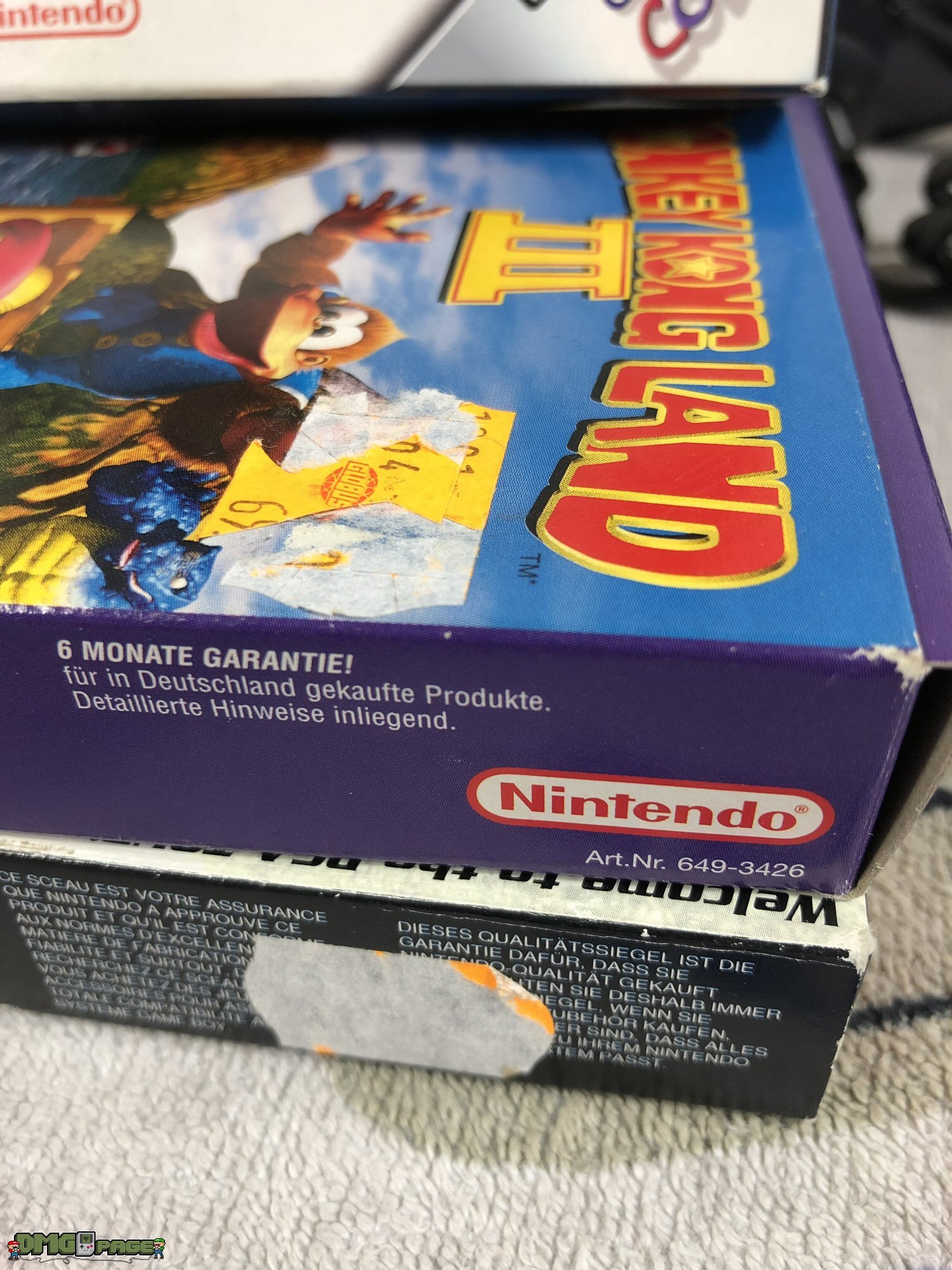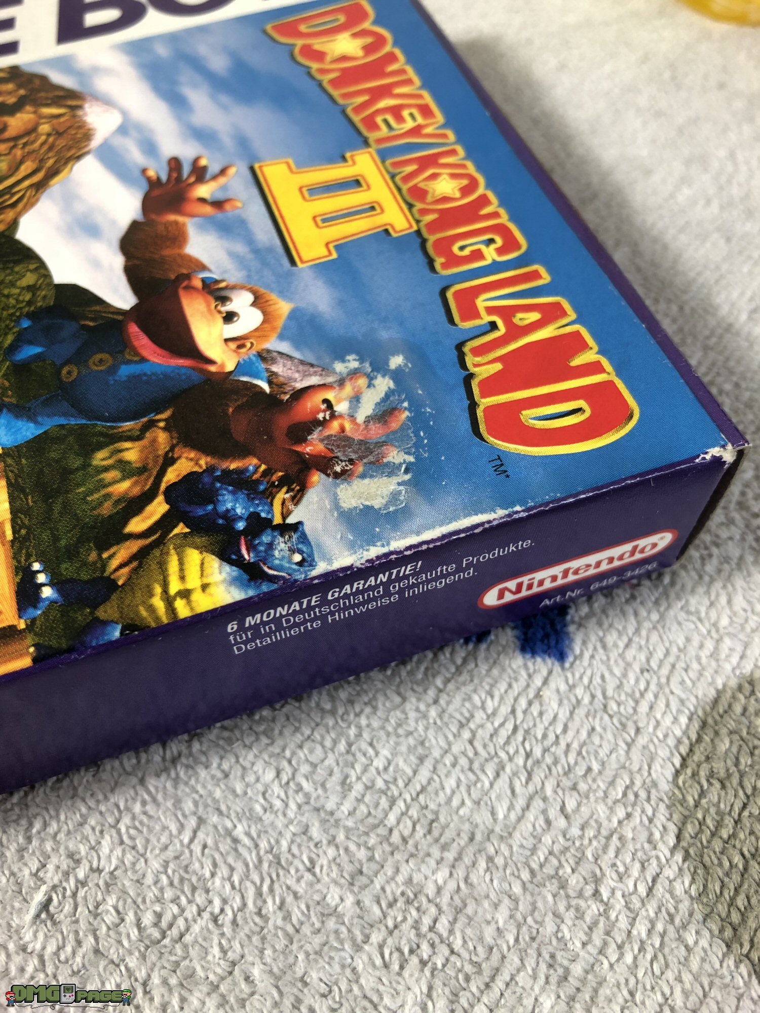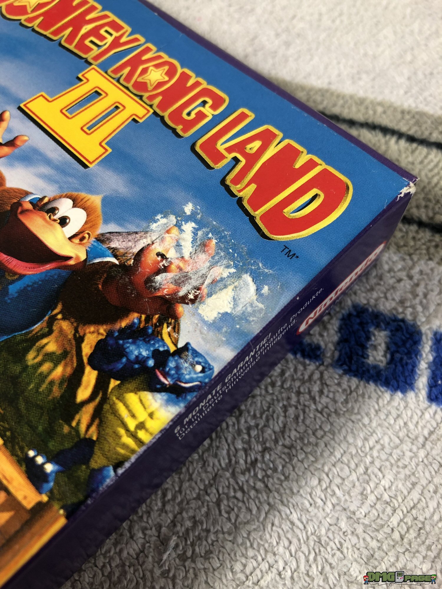 Donkey Kong Land III. Eine bittere Enttäuschung. Der Aufkleber auf dem Cover wurde bereits versucht zu entfernen – dabei ist die OVP darunter an einer kleinen Stelle beschädigt worden. Nach Einsatz des Föns hatte ich mir eigentlich versprochen, den restlichen Teil des Aufklebers abziehen zu können. Doch leider Fehlanzeige. Dieser Aufkleber ist an Hartnäckigkeit nicht zu überbieten. Winzige Fragmente habe ich entfernen können und jedesmal Angst gehabt, die OVP weiter zu beschädigen. Dann der Einsatz von Goo Gone: eine einzige Katastrophe. Schaut euch mal die rechte Kante auf Höhe des Aufklebers an. Das ist keine Lichtreflexion – da habe ich tatsächlich einen Farbabrieb geschafft. Sowas darf natürlich nicht passieren. Entweder habe ich an dieser Stelle etwas zu viel Druck auf die Papp-OVP ausgeübt oder die Goo Gone Dosierung war zu hoch. Bei Ecken und Kanten werde ich in Zukunft wesentlich vorsichtiger sein.