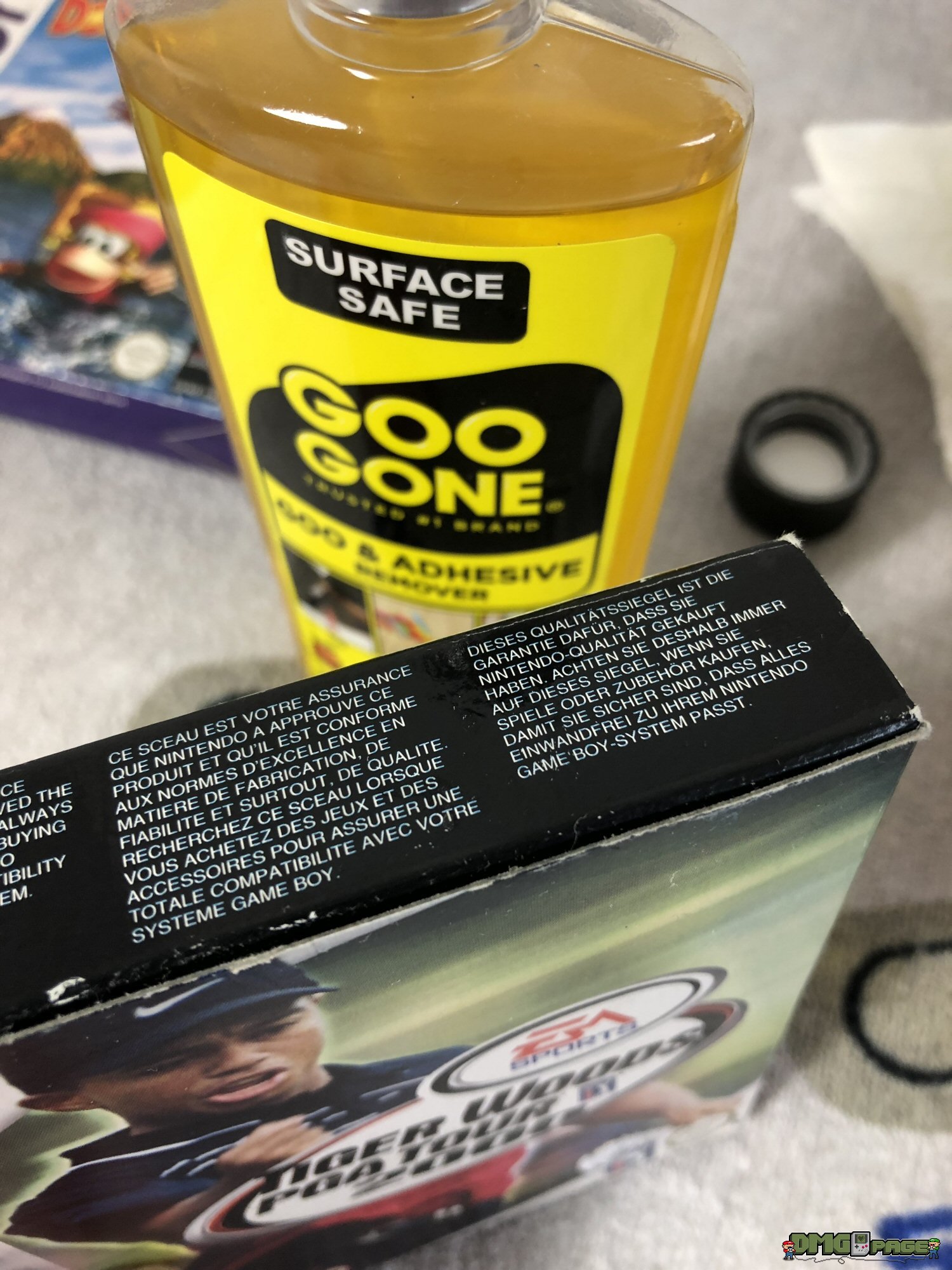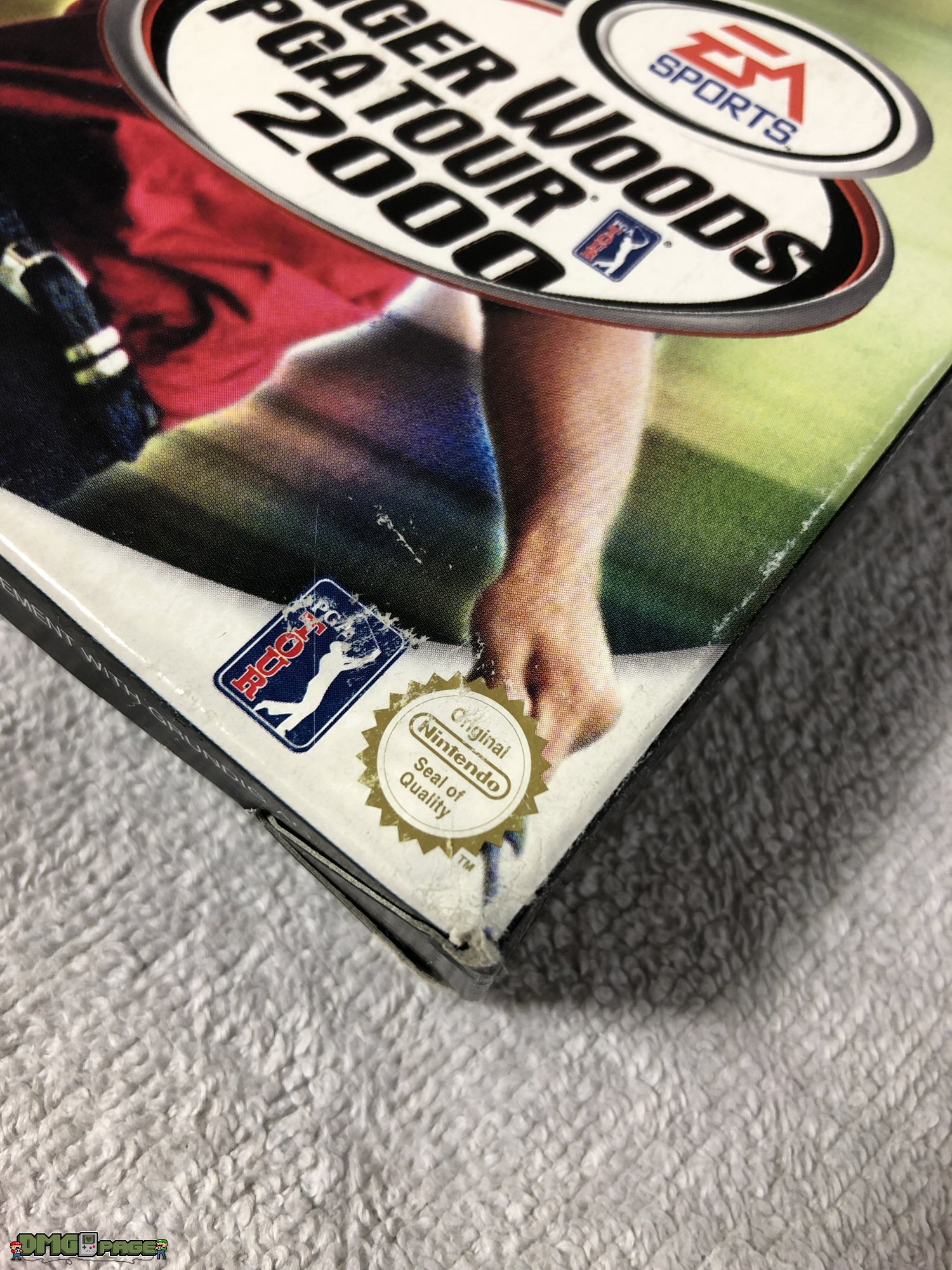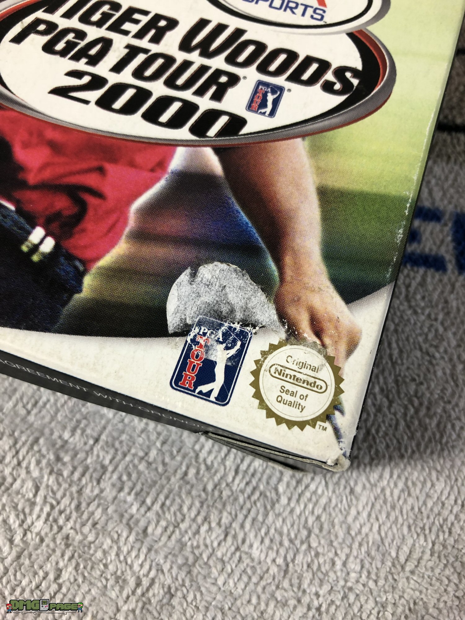 Tiger Woods PGA Tour 2000. Gleich an mehreren Stellen finden wir verschiedene Aufkleber auf der Papp-OVP. Diese lassen sich alle rückstandsfrei entfernen. Der Aufkleber auf dem Cover (unten rechts) macht kleinere Beschädigungen an der OVP sichtbar. Diese waren aber schon vorher vorhanden und basieren nicht auf dem Einsatz von Goo Gone.