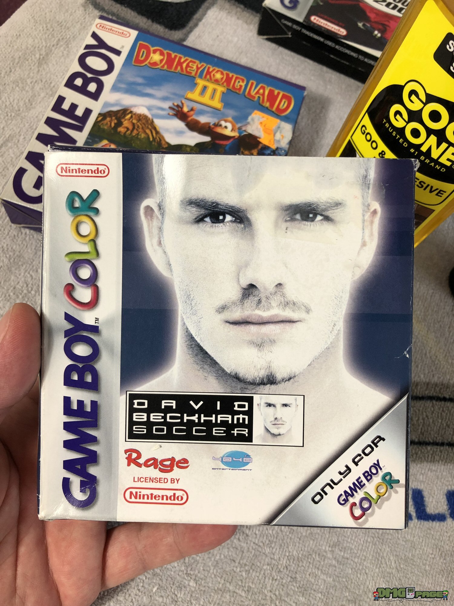 David Beckham Soccer. Hier befindet sich ein Aufkleber mitten auf dem Cover und verdeckt das linke Auge des Spielers. Der Aufkleber ist beschädigt – die Oberfläche überwiegend abgelöst. Im Vorher/Nachher-Vergleich fällt auf, dass Goo Gone nicht alle Klebereste einwandfrei entfernen konnte. Allerdings kann sich das Ergebnis dennoch sehen lassen – kein Vergleich zum vorherigen Stand. Dennoch ist der Aufkleber zu hartnäckig gewesen. In diesem Fall hilft wirklich nur eines: die Zeit nehmen und die Reste mühevoll mit dem Fingernagel abschaben. Im Anschluss erneut eine leichte Oberflächenbehandlung anwenden.