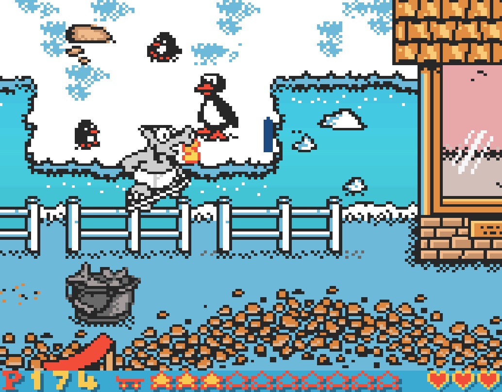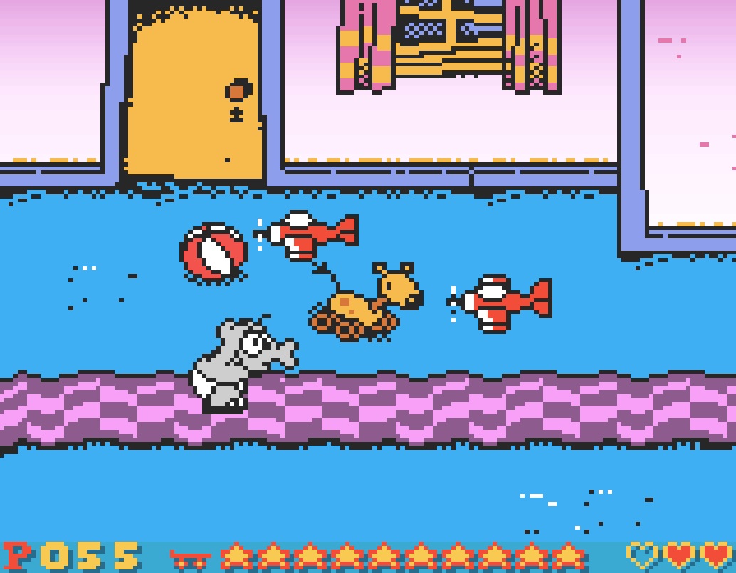 Bruno startet jeden Abschnitt bzw. jedes Level mit drei Herzen. Pro Feindberührung verliert er ein Herz und muss das Level neu starten. Es sei denn, ihr habt bereits den Check Point passiert. Glücklicherweise hat Bruno unendlich viele Continues. Und dann gibt es auch noch Passwörter nach jeweils drei Leveln bzw. am Ende des Abschnitts.