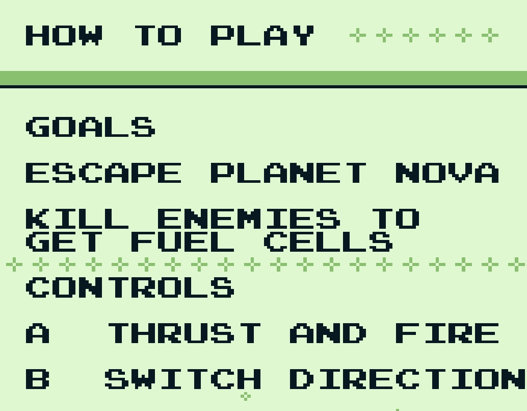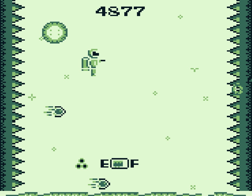 Mit der A-Taste geben wir Schubkraft nach oben und schießen gleichzeitig. Allerdings immer nur in die Richtung in die wir gerade blicken. Wollen wir in die andere Richtung schießen, muss die B-Taste gedrückt werden. Hierbei haben wir zwei Probleme: das Benzin im Jet-Pak ist begrenzt. Ist es verbraucht bedeutet das den sicheren Tod da wir in die Lava fallen. Die zweite Hürde: pro abgegebenen Schuss entsteht ein Rückstoß der uns in die entgegengesetzte Richtung der Blickrichtung befördert. Das bringt uns gefährlich nahe an die Stacheln des jeweiligen Bildschirmrandes.