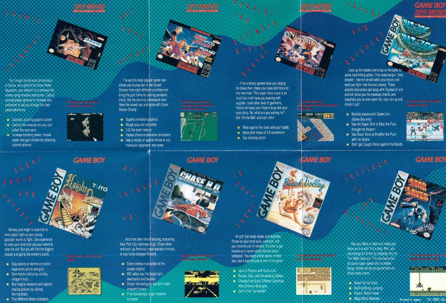 (pwc) Game Boy Werbeflyer die nur Spiele einer bestimmten Firma bewerben, besitzen oft einen personalisierten DMG-Code. Hier steht TAI für Taito. Ein weiteres Beispiel wäre LJN für Ljn. Einen entsprechenden Flyer hatte ich bereits ►hier vorgestellt. Schaut euch den TAI-DMG-US-1 mal an. Wie wirkt dieser Flyer auf euch? Ich finde ihn äußerst langweilig und habe ihn unbeeindruckt zur Sammlung geheftet.