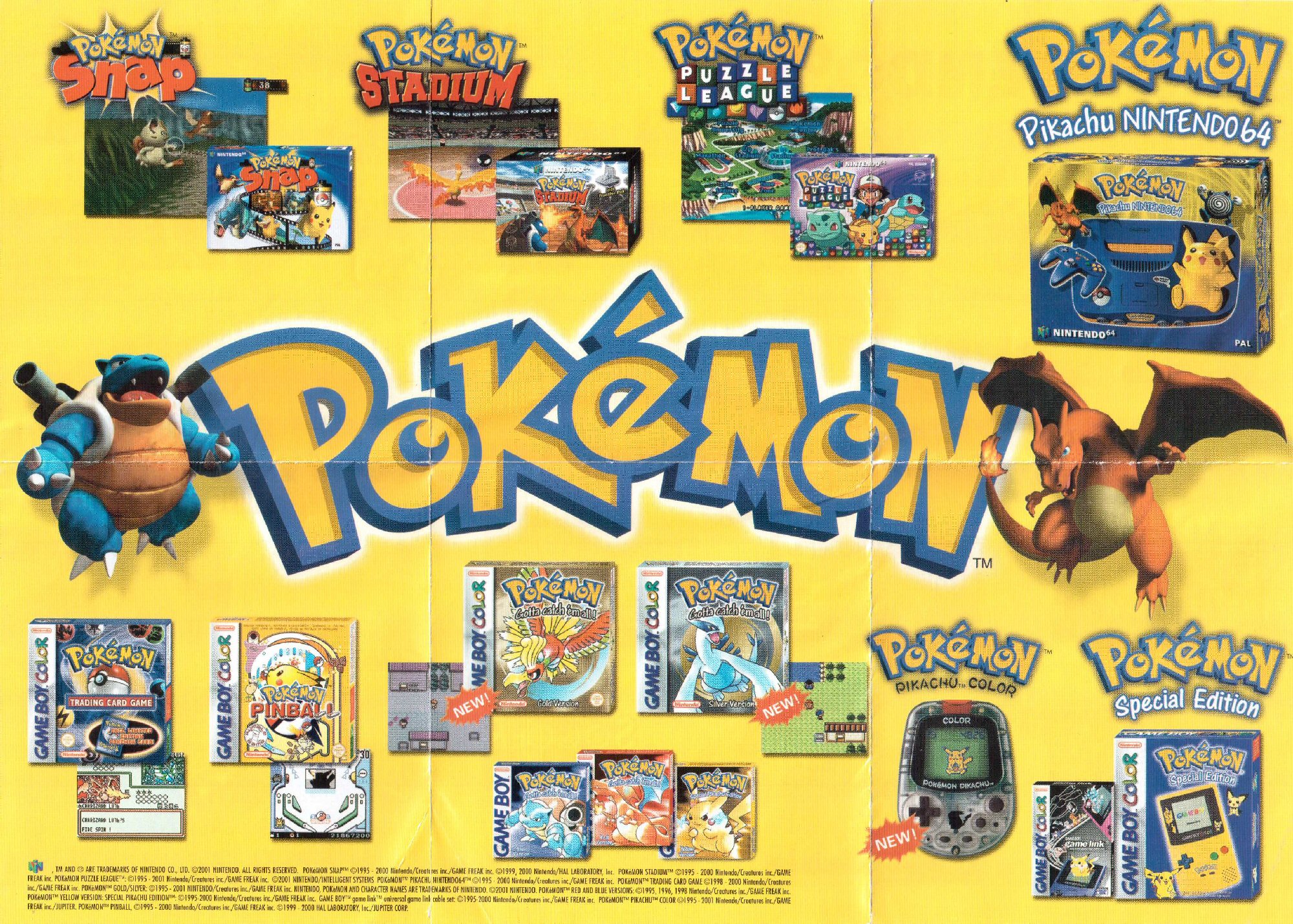 (pwc) Den Game Boy Werbeflyer P-(NOE)-A4-EUR-12 finde ich total klasse, denn er bietet uns beidseitig viele tolle Game Boy Spiele. Während die Vorderseite unter dem Slogan „Game Boy – feel everything everywhere“ steht und aktuelle Game Boy Color Titel vorstellt, bietet uns die Rückseite des Flyers alles was das damalige Pokémon-Herz begehrt hat. Darunter die absoluten Highlights und Neuerscheinungen Pokémon Gold, Pokémon Silber und das Pokémon Pikachu Color (nicht zu verwechseln mit dem Pokémon Mini). Alles in allem ein wunderbarer Werbeflyer der schöne Erinnerungen weckt.