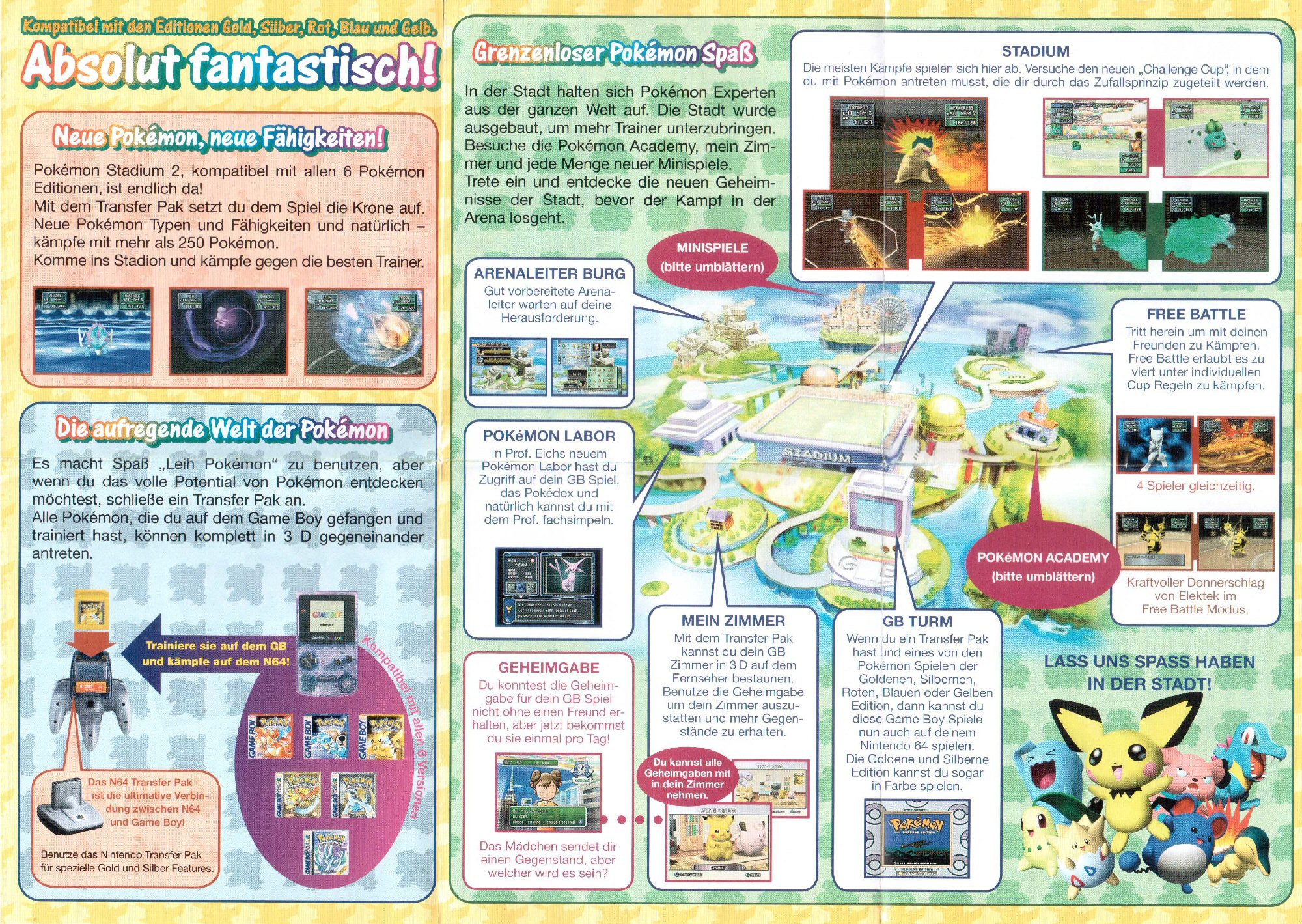 (pwc) Bei diesem Pokémon Stadium 2 (N64) Flyer kommt auch der Game Boy zur Geltung. Durch das geniale Transfer Pak ist es möglich, deine vorher auf dem Game Boy trainierten Pokémon direkt als 3D-Modelle in Pokémon Stadium 2 zu laden. Auf der Rückseite des Flyers wird für eine hohe Kompatibilität geworben: so werden die Pokémon Editionen Rot, Blau, Gelb, Silber, Gold & Kristall unterstützt.