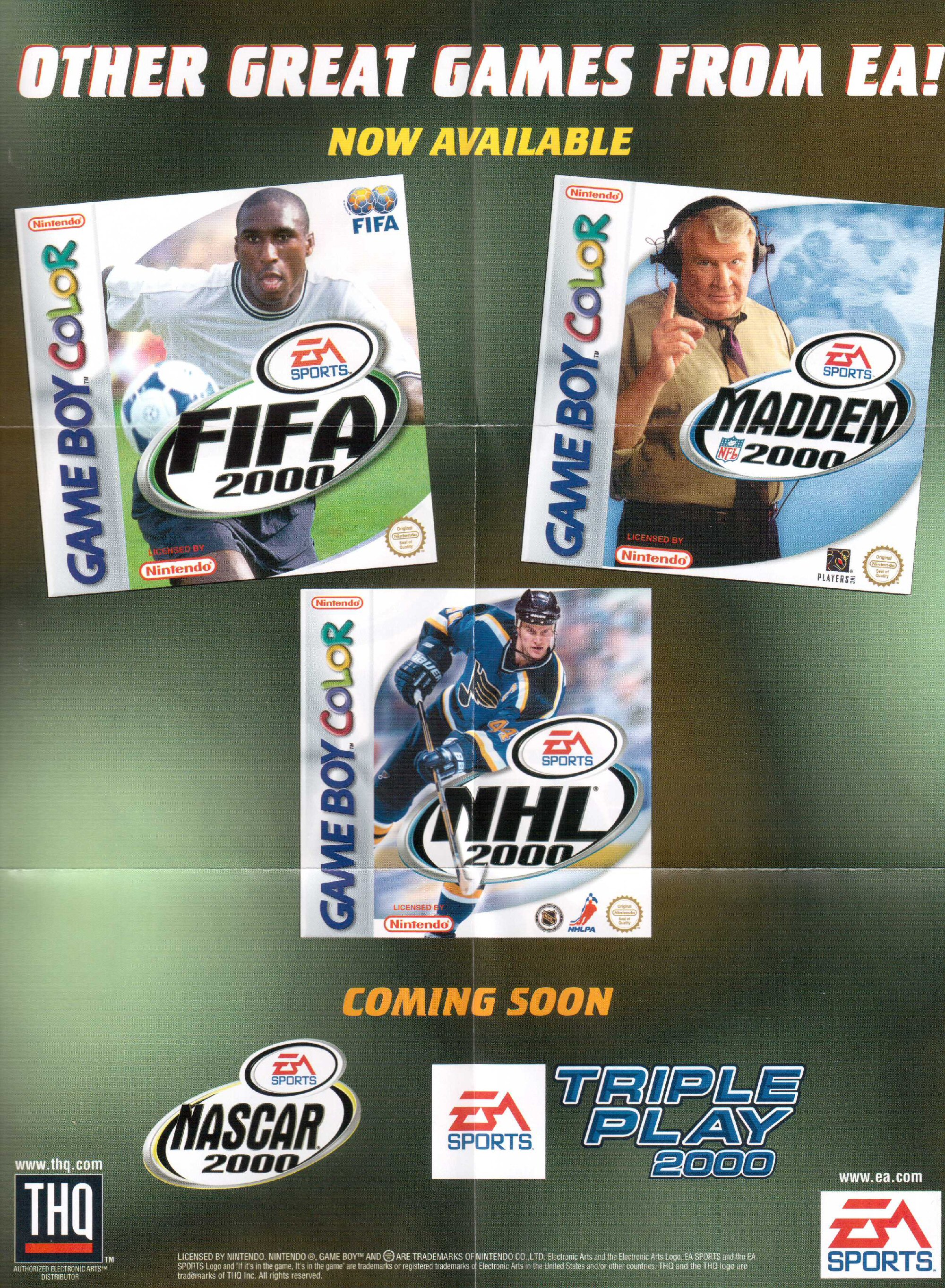 (pwc) Die Sammlung der Game Boy Posterbeilagen wächst und wächst. Dieses Exemplar liegt dem Game Boy Color Spiel Tiger Woods PGA Tour 2000 bei. Während die Vorderseite wohl nur ausgesprochene Tiger Woods Fans anspricht, freuen sich über die Rückseite hingegen Fußball-, Football- und Eishockey-Fans.