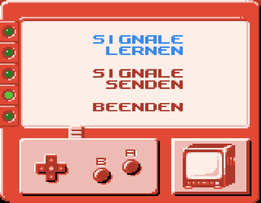 Im Agenten-Organizer wählt ihr die Fernbedienung aus. Hier erhaltet ihr auch eine Übersicht von Geräten, die ihr aus der Ferne steuern könnt. Entscheidet euch für das Fernsehgerät. Um ein bestimmtes Signal von der TV-Fernbedienung auf den Game Boy Color zu übertragen, muss der Game Boy das Signal aufnehmen und speichern. Über die Funktion „Signale lernen“ bringt ihr eurem Game Boy bei wie eine TV-Fernbedienung zu funktionieren. Entscheidet euch welches Signal ihr auf welche Taste legen wollt. In meinem Fall habe ich das An/Aus-Signal der Fernbedienung auf Taste A des Game Boy gelegt.