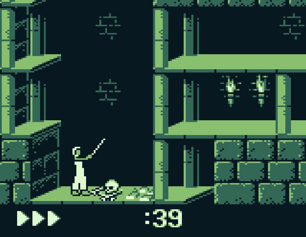 Die Sache mit den Schritten ist in Prince of Persia sowieso mit Vorsicht zu genießen. Über das Steuerkreuz wird die Standardbewegung abgewickelt. Mit Taste A ist ein Sprung möglich, der bei Anlauf noch verstärkt werden kann. Taste B hingegen lässt euch schleichen – ihr macht genau einen Schritt. Nicht mehr. Dass die Bewegung präzise ausfallen muss, merkt ihr praktisch immer dann, wenn es leider schon zu spät ist: entweder ihr landen in einer Stachelfalle oder fallt mehr als zwei Stockwerke nach unten. Beides führt unweigerlich zum Tode.