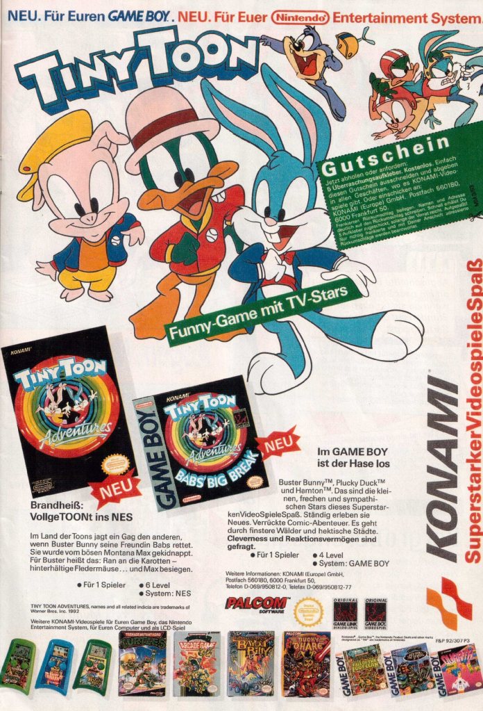 (pwc) Erneut ist mir eine Game Boy Werbeanzeige aus einem Micky Maus Heft in die Hand gefallen: Funny-Game mit TV-Stars. Damit sind natürlich die Tiny Toons rund um Buster Bunny, Plucky und Hampton gemeint. Babs‘ Big Break ist der erste von drei Tiny Toon Adventures Spielen auf dem klassischen Game Boy. Die fünf kostenlosen Überraschungsaufkleber, die man mit dem aufgedruckten Gutschein erhalten hat, gibt es übrigens immer mal wieder zu Sammlerpreisen auf Ebay. Konami hat sich allerdings nicht auf fünf Aufkleber beschränkt – ich habe alleine neun Stück ausfindig machen können: Tiny Toon Buster Bunny, Tiny Toon Hampton, Teenage Mutant Hero Turtles (zwei verschiedene Motive), Road Fighter, Track & Field II, Castlevania, Top Gun und Parodius.