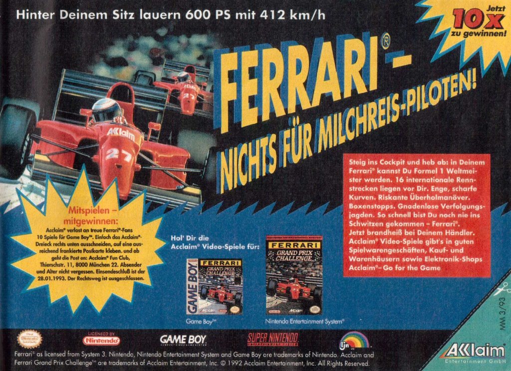 Ebenfalls in dieser Ausgabe: Ferrari Grand Prix Challenge. „Hinter deinem Sitz lauern 600 PS mit 412 km/h“. 10 Exemplare für den Game Boy gab es ebenfalls zu gewinnen. Der Einsendeschluss war der 28.01.1993.