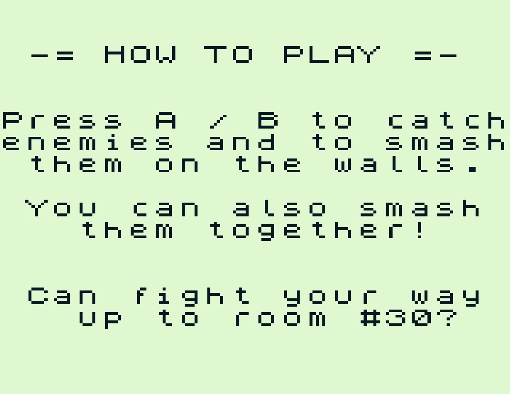 Insgesamt gilt es 30 Räume zu überstehen, durch die sich der Game Boy prügeln muss. Die Steuerung ist recht simpel: mit dem A oder B-Button greifst du nach einem Gegner und wirfst ihn erneut mit A/B gegen die Wand. Oder du klatschst ihn gegen einen zweiten Gegner.