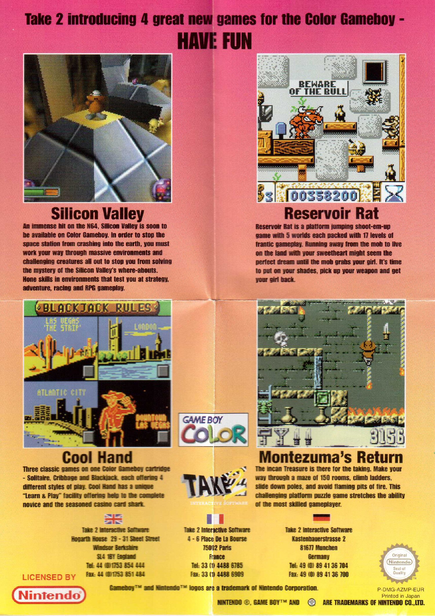 (pwc) Mit dem Werbeflyer P-DMG-AZMP-EUR kündigt Take 2 vier neue Game Boy Color Spiele an: Silicon Valley (leider nur ein N64 Screenshot), Reservoir Rat, Cool Hand und Montezuma’s Return. Mal abgesehen von den vorgestellten Spielen, finde ich diesen Flyer eher schwach gestaltet. Was meint ihr?