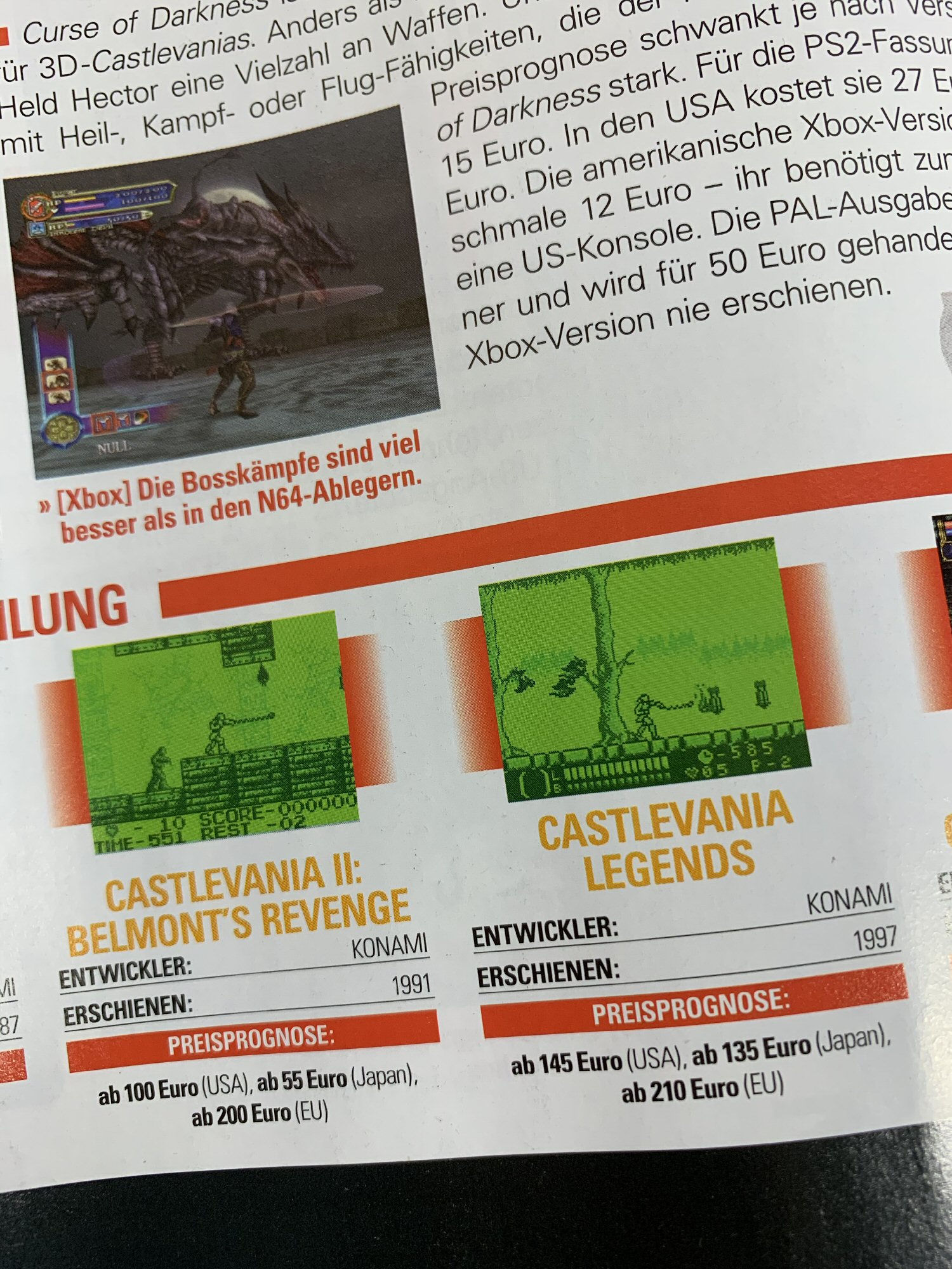 Neben einem Vampire Killer (540 € MD JP-Version), Symphony of the Night (210 € PSX EU-Version) oder Lords of Shadow (5 € Xbox 360 EU-Version), begegnen uns selbstverständlich auch Belmont’s Revenge (200 € GB EU-Version) und Legends (210 € GB EU-Version).