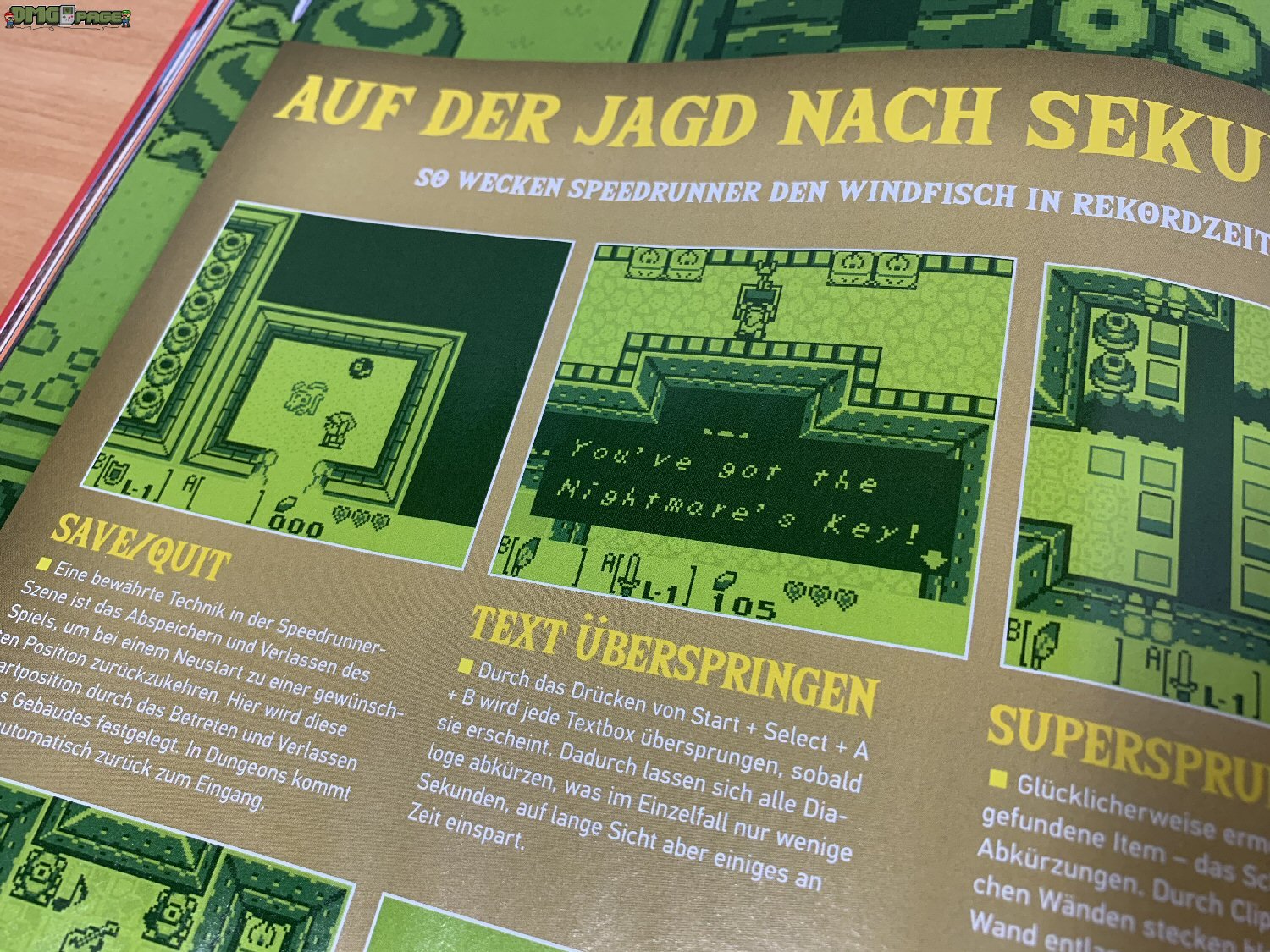 Weiter geht’s mit dem Bericht zum Expertenwissen zu The Legend of Zelda Link’s Awakening. Auf ganzen sechs Seiten gibt es einen kleinen Einblick in das Game Boy Abenteuer inkl. wertvoller Tipps für Speedrunner. Auch erfahren wir, dass dieser Teil der Zelda-Serie der erste war, in dem man etliche wichtige Gegenstände direkt beim Händler kaufen konnte und das Schwert erstmals keinem konkreten Button zugeordnet war. Vielmehr durfte der A und B-Button des Game Boy mit Gegenständen frei belegt werden.