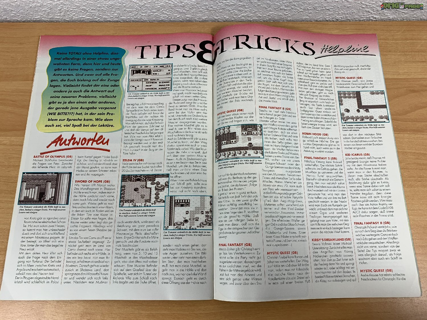 Im Kapitel „Tips & Tricks Helpline“ bekommt ihr etliche Antworten auf Fragen, die in vorherigen regulären TOTAL! Ausgaben gestellt wurden. A la Fans helfen Fans erfährt der Leser nun endlich, wie man die Gegner in den Baumhäusern bei Bart Simpson’s Escape from Camp Deadly besiegt oder sich bei Kid Icarus dem Minotaurus entledigt.