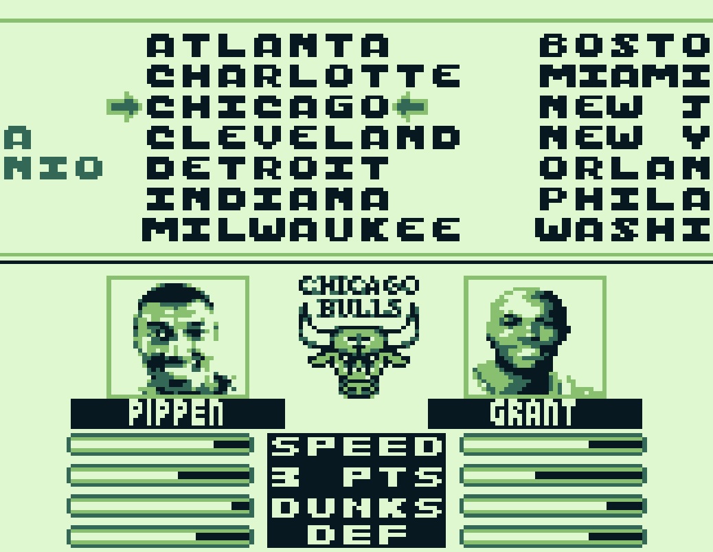 Die Team-Auswahl ist beträchtlich: alle 27 NBA-Mannschaften (aktuell sind es 30) haben es in die Game Boy Version geschafft. Aufgeteilt sind die Teams in die Eastern Conference mit der Atlantic und Central Divison (heute: Atlantic, Central, Southeast) und die Western Conference mit der Midwest und Pacific Division (heute: Northwest, Pacific, Southwest).