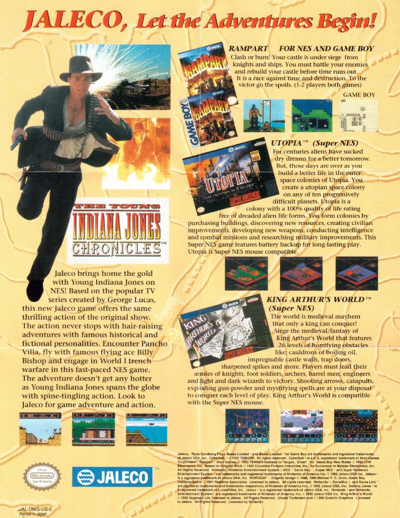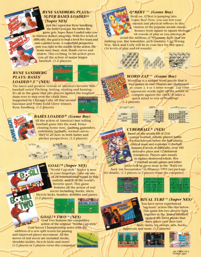 (pwc) Na das ist doch mal ein lebendiger Werbeflyer. Der junge Indiana Jones auf der Vorderseite steht für permanentes Abenteuerfeeling. Und tatsächlich: in Rampart, Utopia und King Arthur’s World gibt es einiges zu erkunden. Die Rückseite hingegen bietet ein Genremix: sportlich wird’s bei Bases Loaded, in Word Zap setzt ihr aus Buchstaben ganze Wörter zusammen und mit Q*bert meldet sich ein absoluter Arcade-Klassiker aus dem Jahr 1982 zurück. Wie ihr bestimmt bereits erkannt habt, steht die Abkürzung JAL für JALECO.