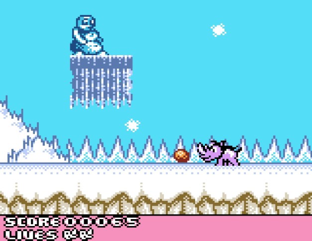 Richtig genial ist die unglaublich schnelle Bewegungsfähigkeit von Rhino. Im Prinzip haben wir es hier mit einem schier unaufhaltsamen Panzer zu tun der ganz nebenbei Feuer spucken kann. Diese Mächtigkeit ist kaum gefährdet, denn auch wenn das Spiel keine Continues bietet, so finden sich immer mal wieder Extraleben. Außerdem erhaltet ihr nach jedem Abschnitt ein Passwort.