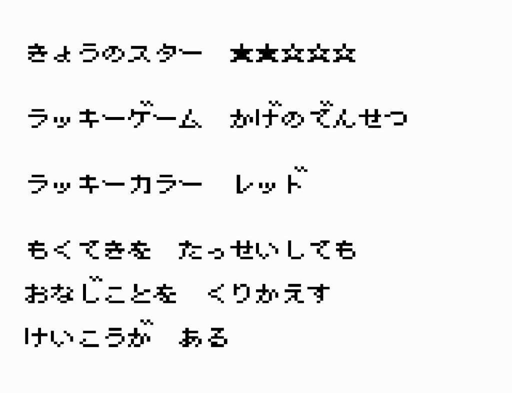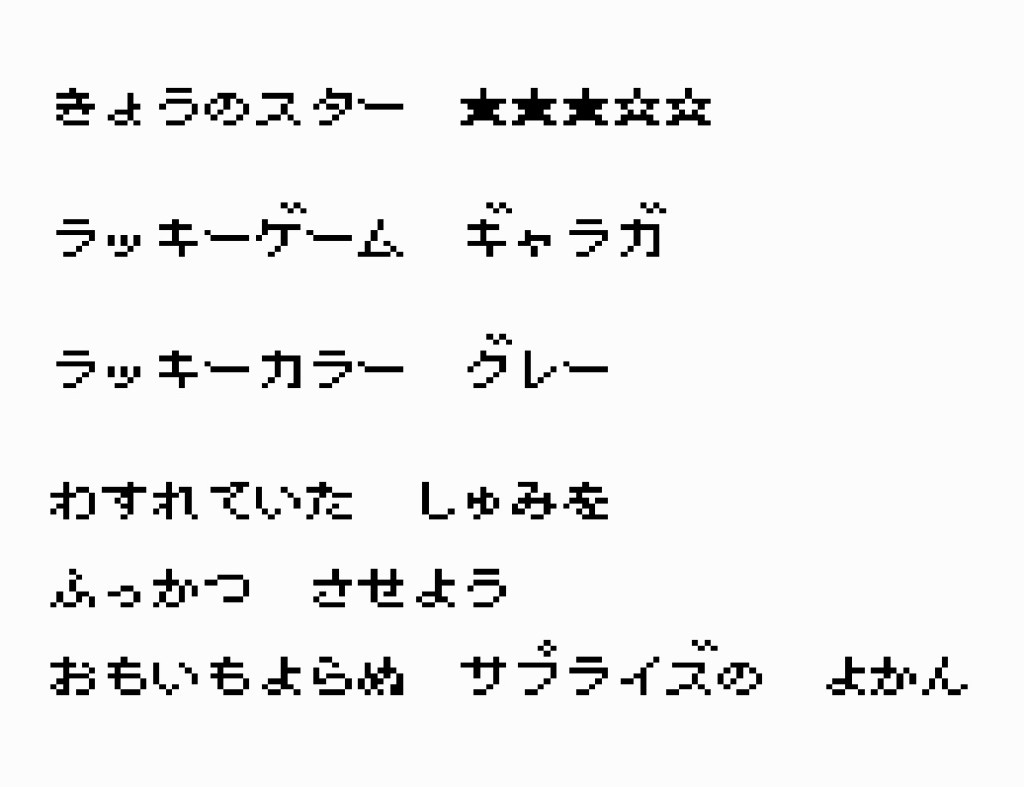 Der Inhalt der Box wird leider nicht durch Grafiken, sondern Textfelder kenntlich gemacht. Dies führt natürlich zu einem Übersetzungsaufwand, weswegen ich hier lediglich ein paar wenige Beispiele vorstelle. Auf der Produktseite zum Spiel gibt Game Impact an, dass die Boxen Videospiele, Glücksfarben und Ratschläge beinhalten. In meinen vier Versuchen, konnte ich die Spiele Galaga (unbekannt ob es sich hierbei um die Game Boy oder Famicom Version handelt) und Kage no Zonsetsu (DS) aus den Boxen fischen. Auch zwei Ratschläge waren dabei und ich hoffe, diese richtig übersetzt zu haben: „Wenn du ein Frosch bist, kannst du alleine kämpfen“ sowie „Lass uns Sushi machen, das Spaß gemacht hat“.